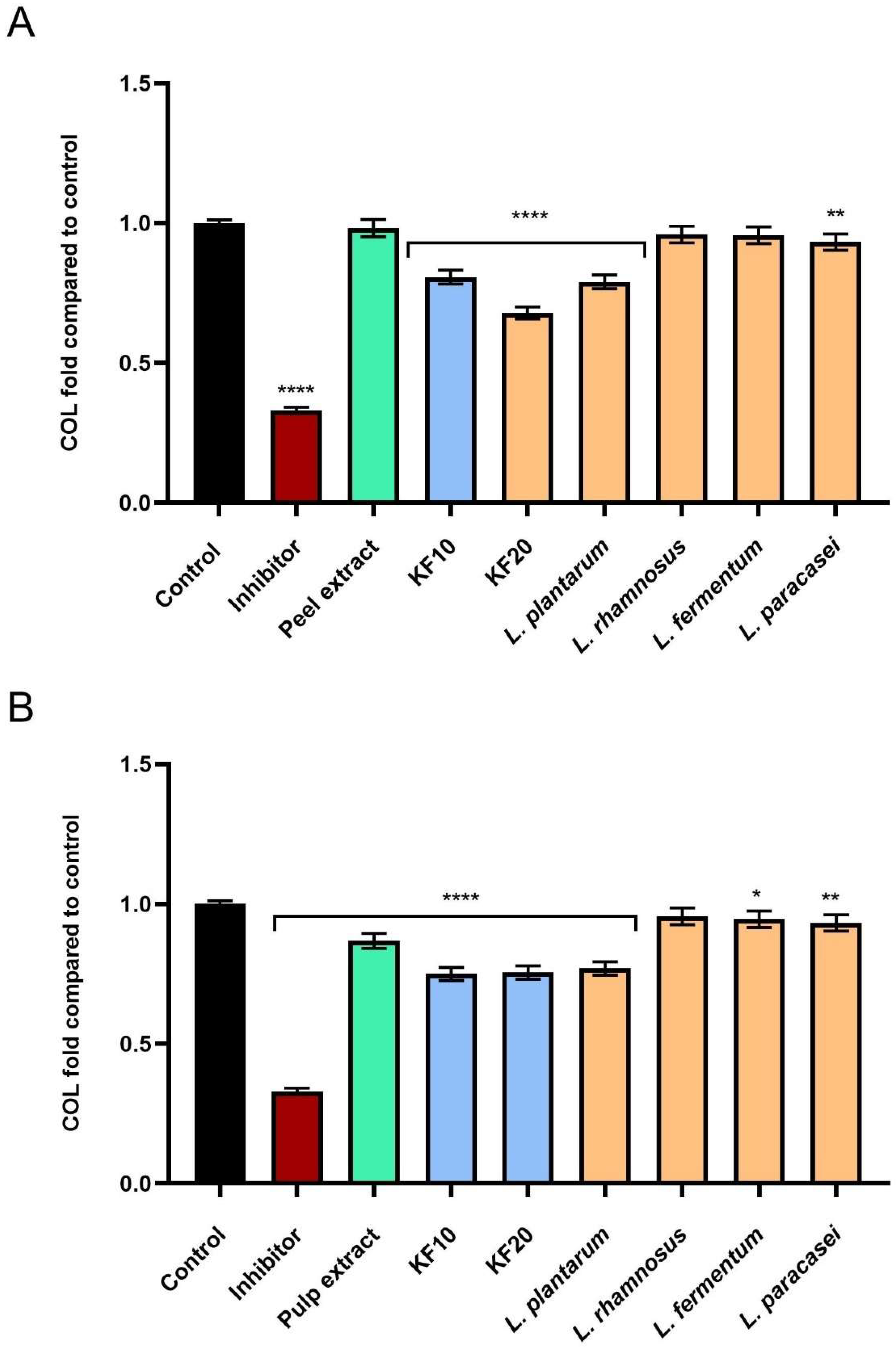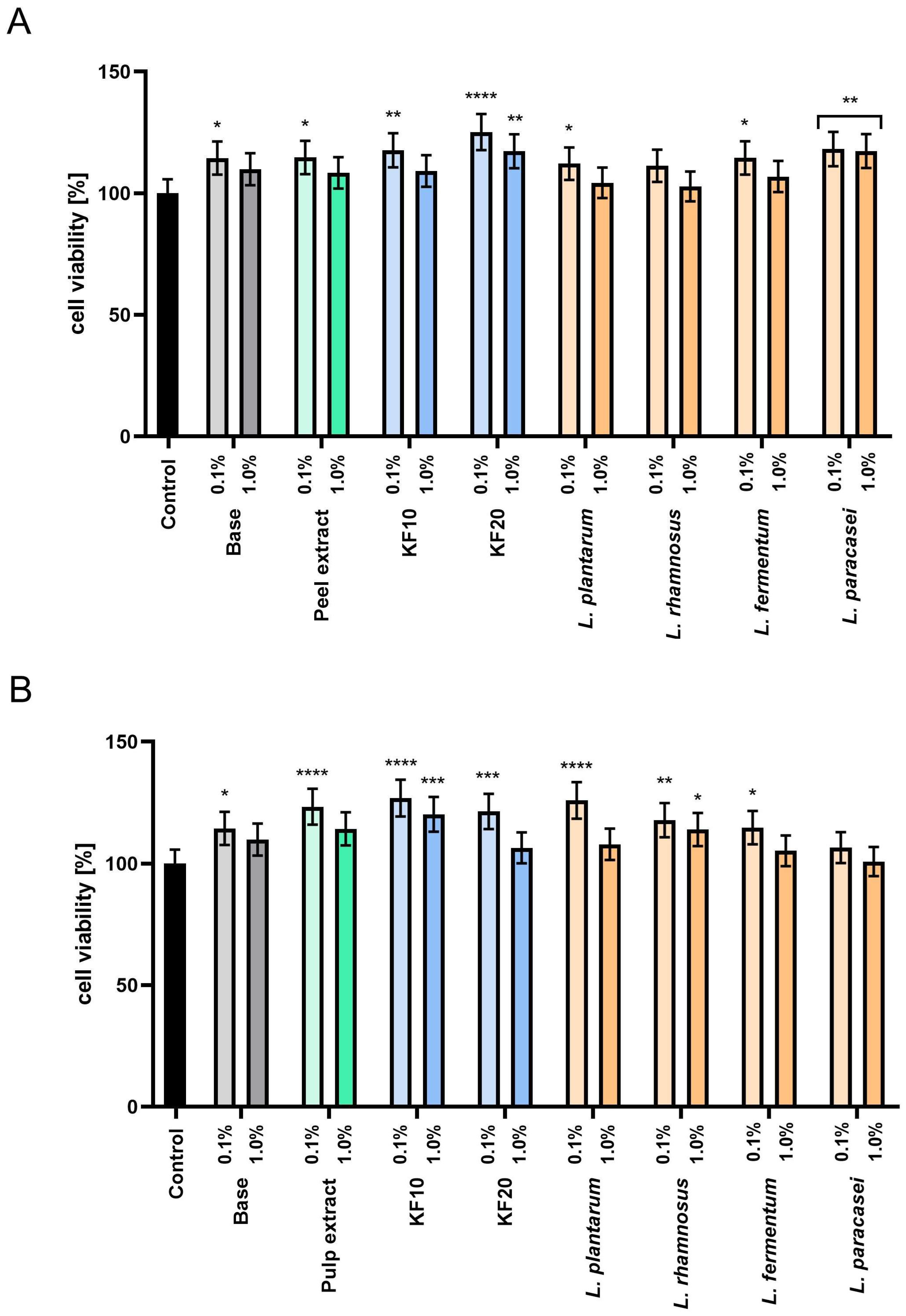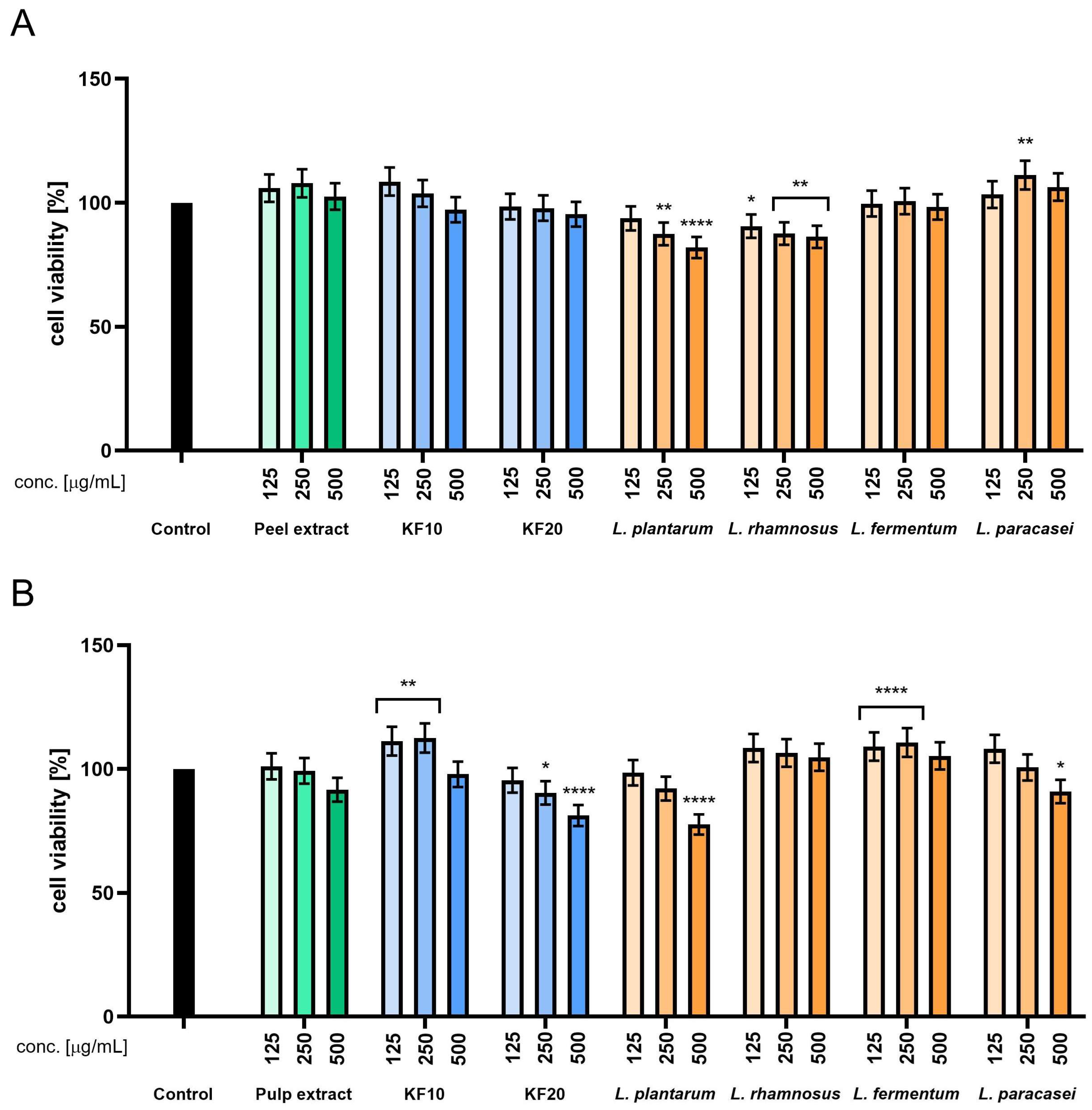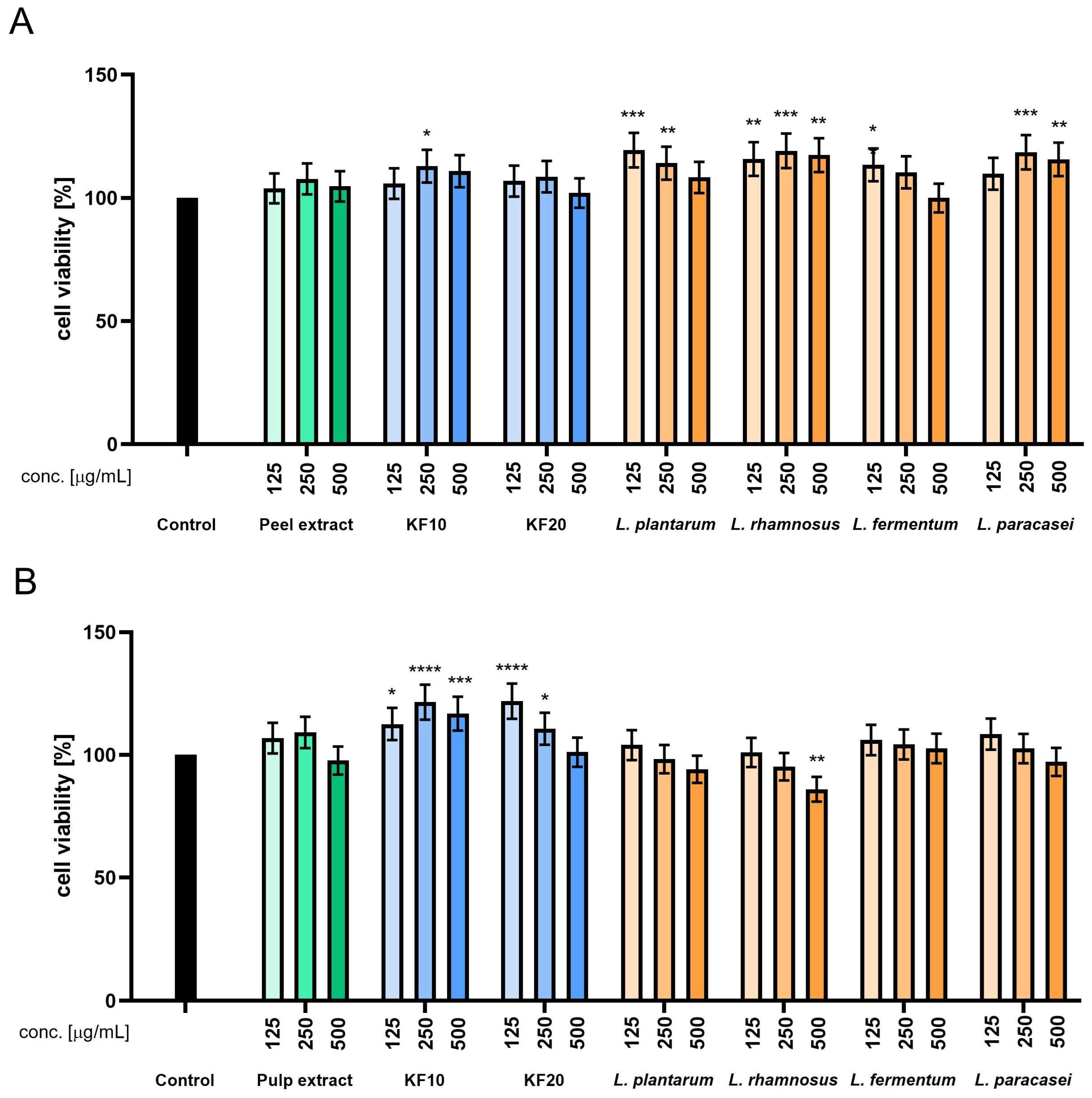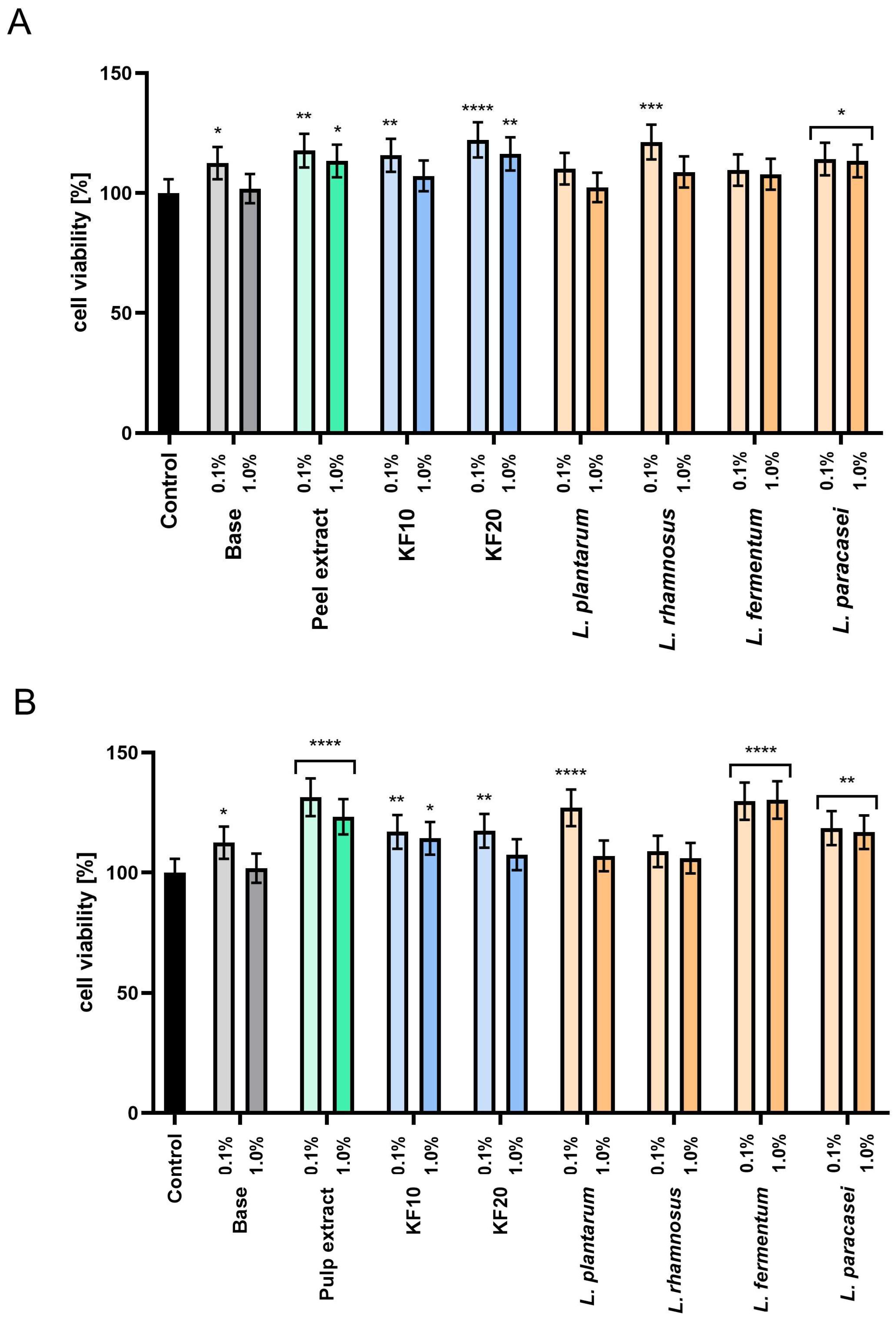 L. rhamnosus significantly enhanced cell viability, reaching up to 119% at 500 µg/mL. Among pulp-derived samples, the most substantial increase was observed for the