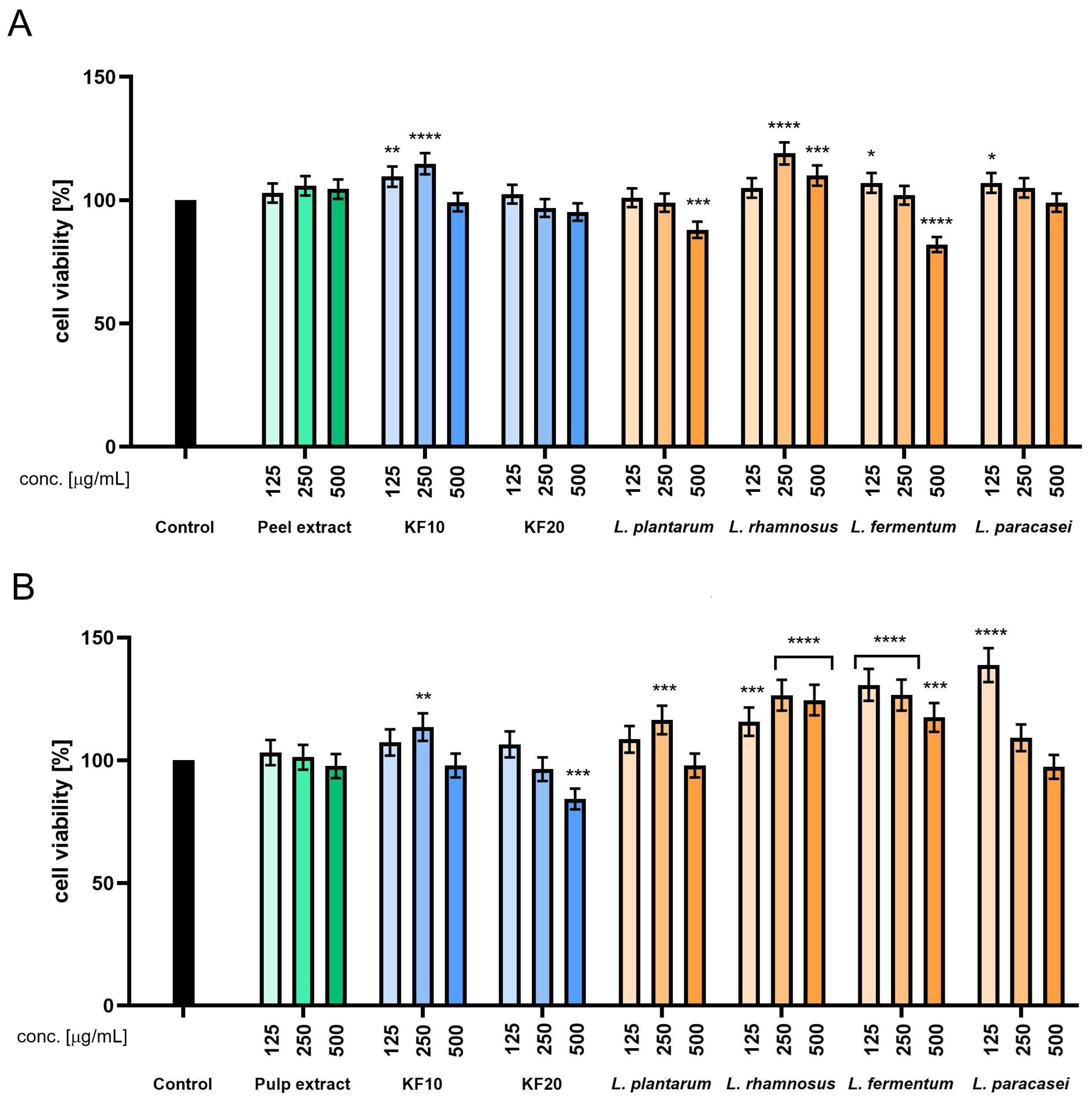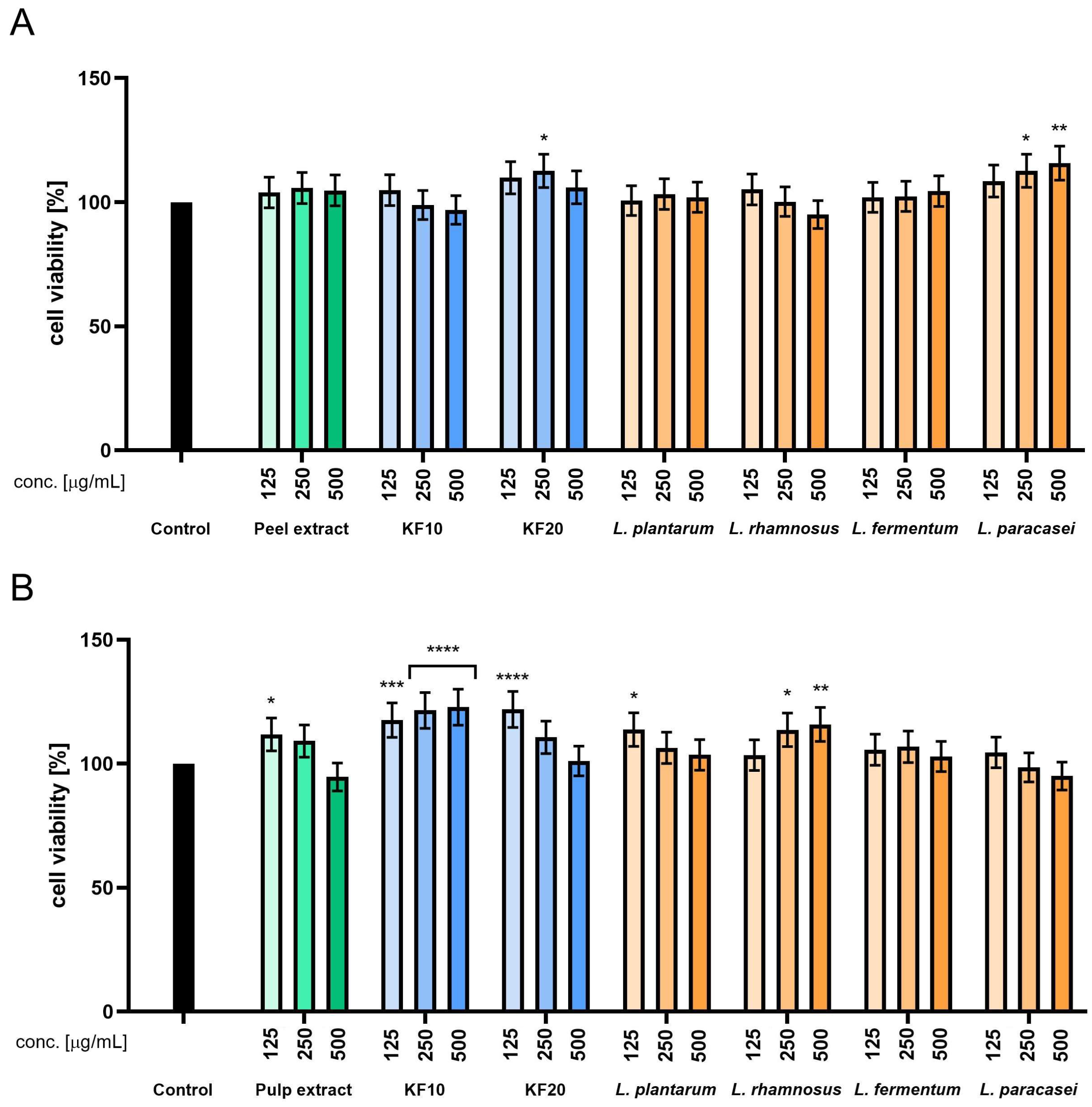 L. plantarum showed a concentration-dependent reduction in HaCaT cells viability, with a notable decrease observed at 500 µg/mL, indicating potential cytotoxicity at higher doses. The studies conducted on samples derived from pumpkin pulp demonstrated that kombucha fermentation for 10 days significantly enhanced cell viability, with F10-treated samples reaching approximately 115–118% at concentrations of 125–250 µg/mL. Ferments obtained with