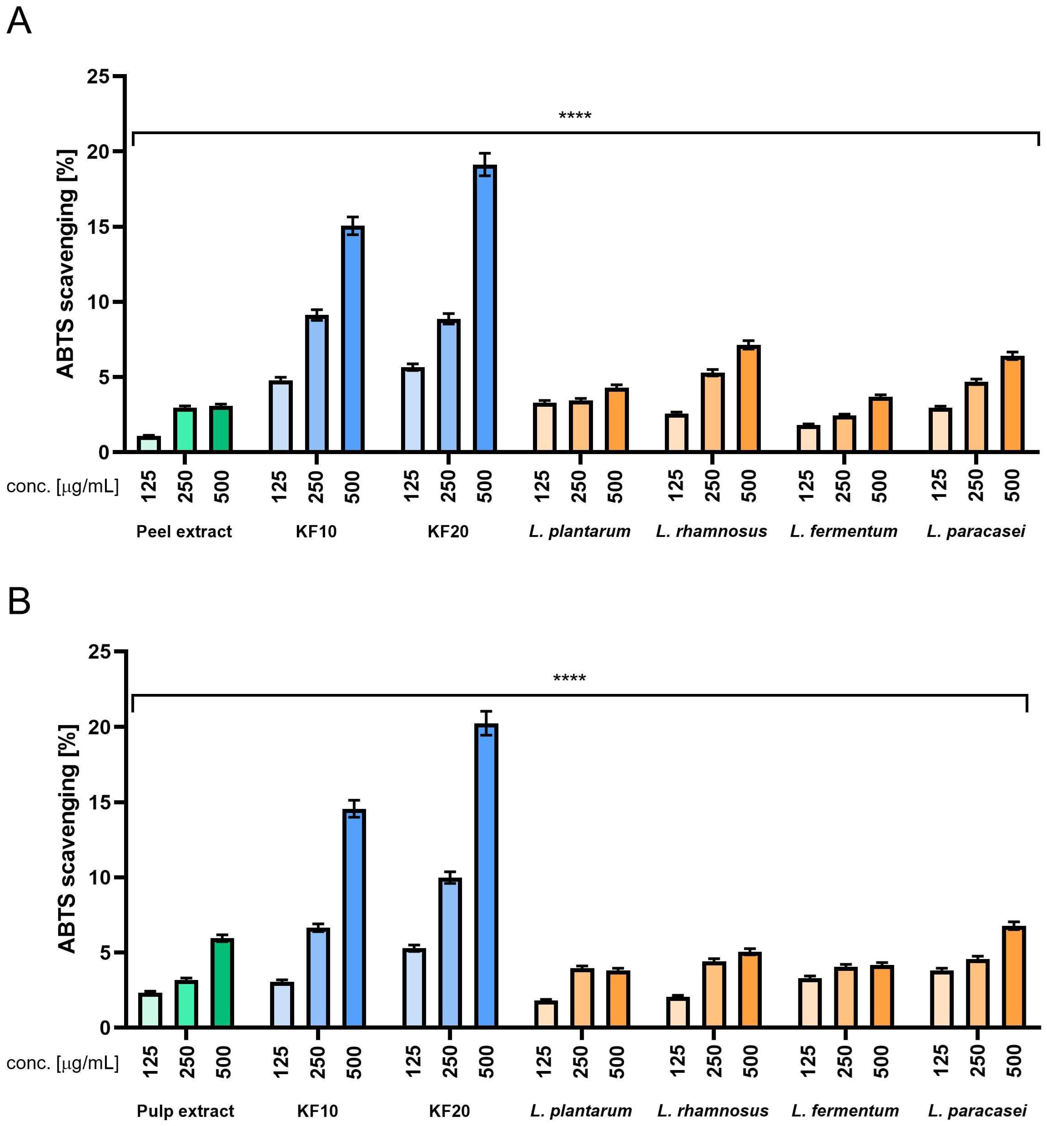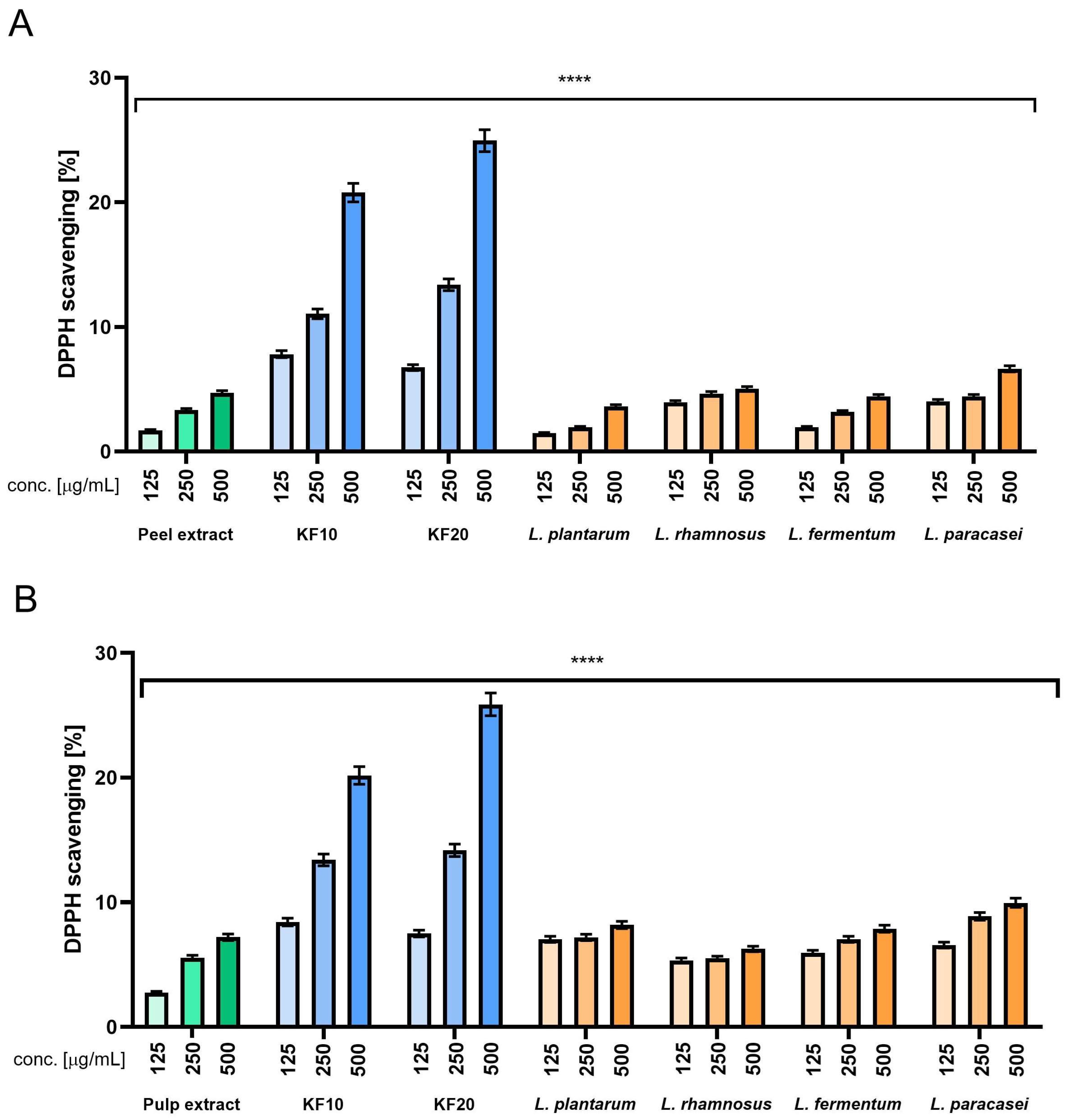 46], with minor modifications. The tested materials included non-fermented aqueous extracts of peel and pulp, kombucha-fermented extracts obtained after 10 and 20 days of fermentation, and samples fermented with individual strains of lactic acid bacteria (