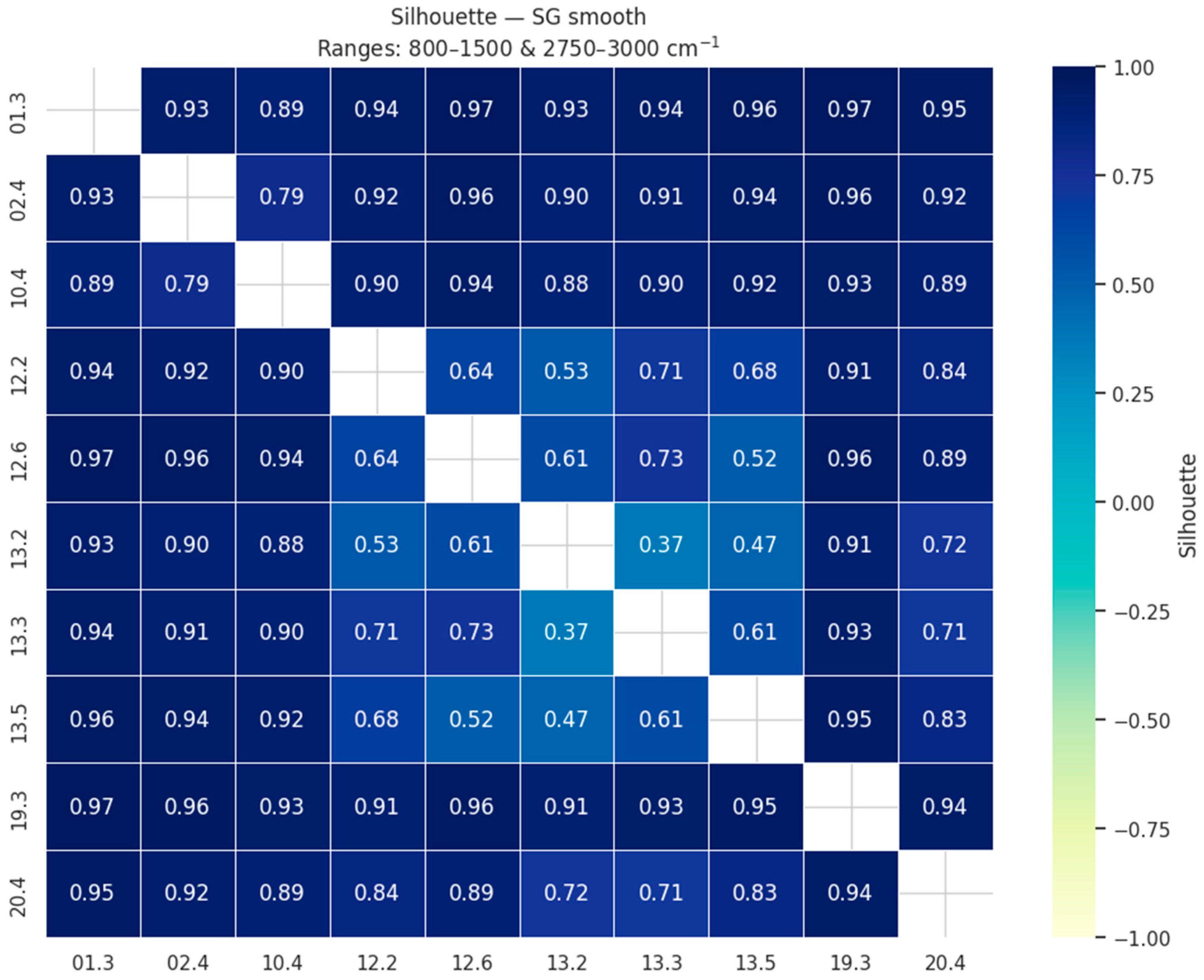 The evaluation showed that the highest clustering quality was obtained for simple approaches, with Savitzky–Golay smoothing (mean silhouette = 0.84) and raw spectra without preprocessing (0.84) ranking at the top, closely followed by Savitzky–Golay smoothing combined with baseline correction and SNV normalization (0.83). Other methods, including baseline correction alone or in combination with MSC, MinMax, or Z-score scaling, yielded slightly lower but still comparable results (≈0.82). More complex preprocessing, particularly the use of Savitzky–Golay derivatives, resulted in markedly lower clustering quality (silhouette < 0.8, and as low as 0.47 for the second derivative). These results indicate that extensive preprocessing is not required for this dataset, and that simple smoothing or even the use of raw restricted spectra is sufficient to achieve clear and robust clustering and separation of samples according to their origin.