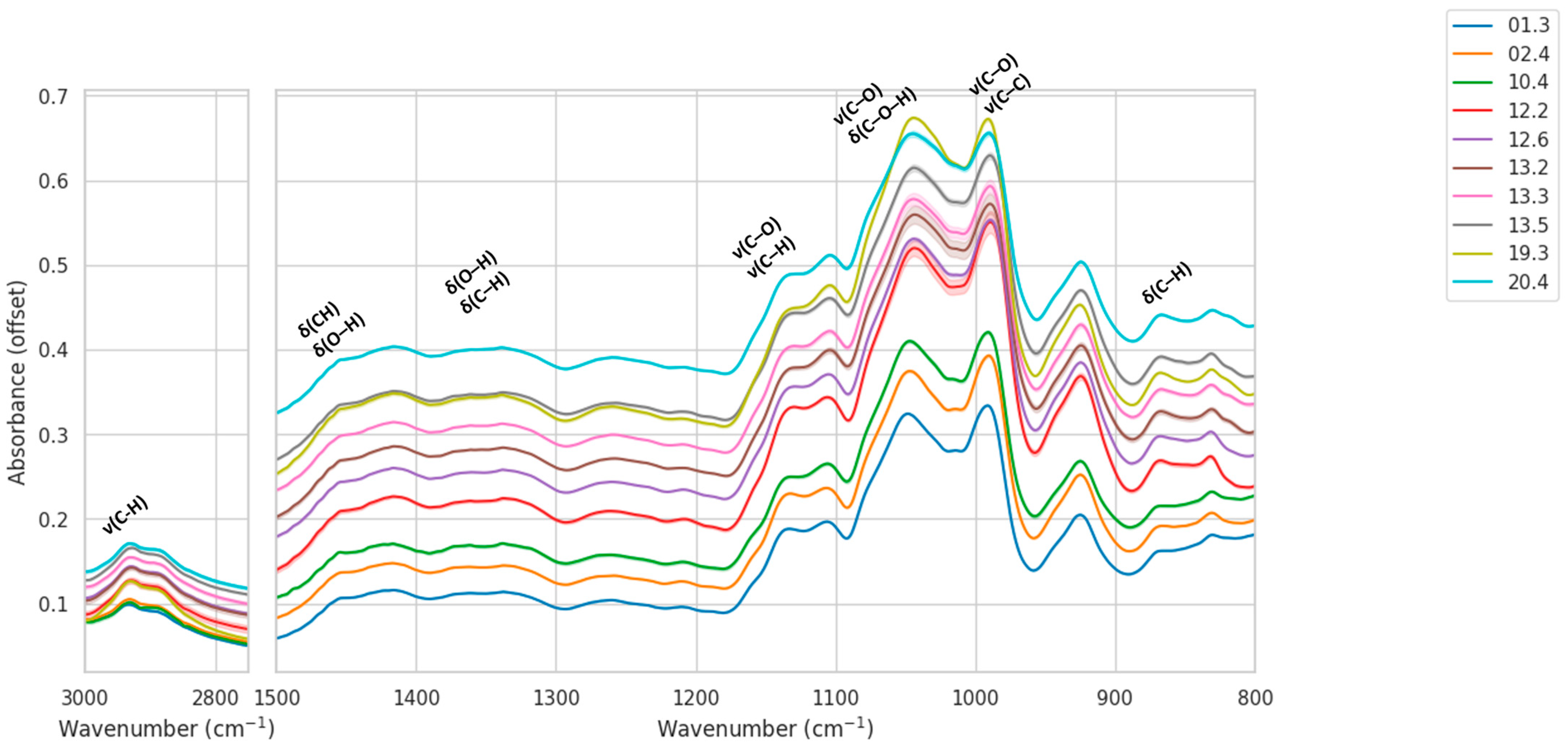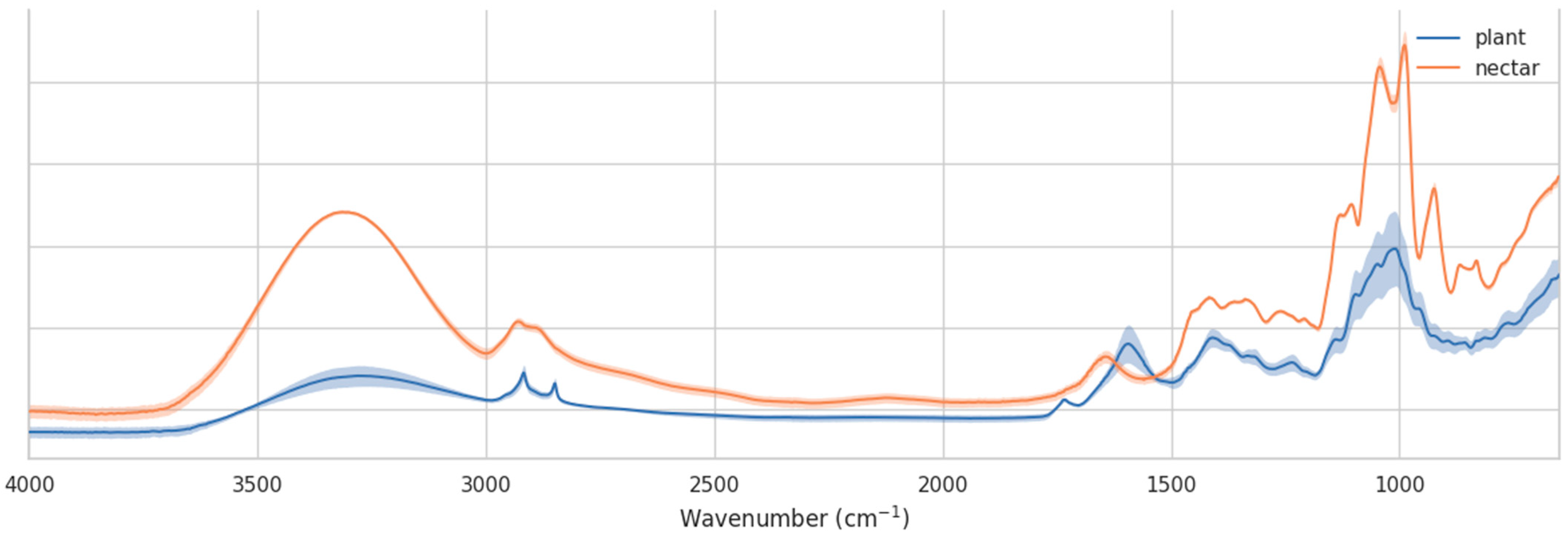 −1. Additional contributions from the C–H stretching region also plays a role, though to a lesser extent. These findings align with the carbohydrate-dominated nature of nectar IR spectra, as observed also for
