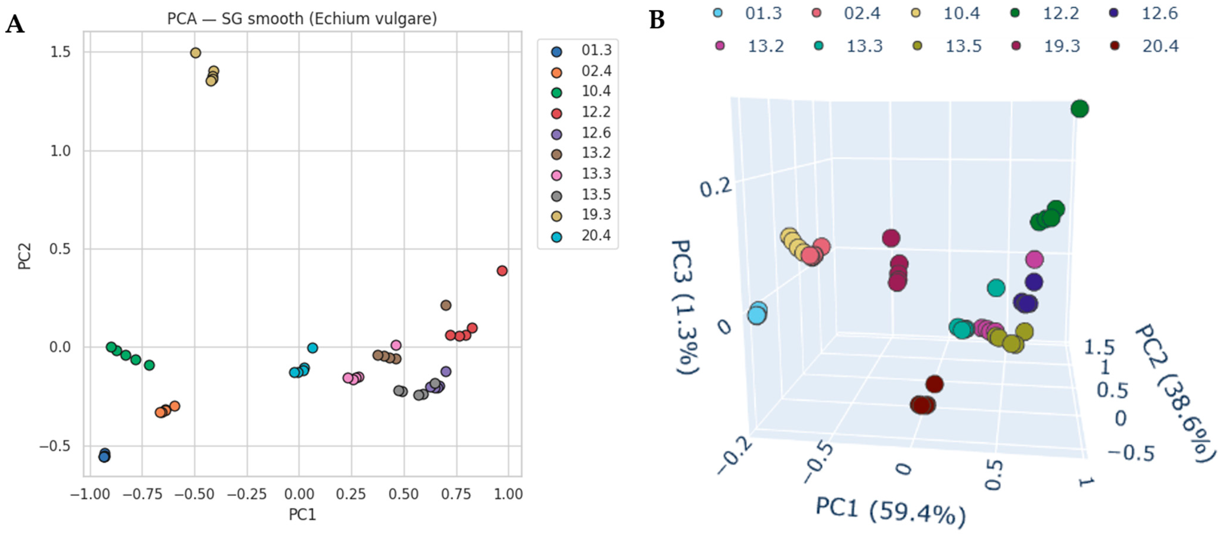 Figure 3). For the SG-smoothed dataset, the first three components explained together nearly 99.3% of the variance (PC1 = 59.4%, PC2 = 38.6%, PC3 = 1.3%). Samples grouped tightly according to their geographical origin, with most locations clearly separated along PC1 and PC2. Nevertheless, samples from locations 12 and 13 partially overlapped, reflecting their high spectral similarity. The three-dimensional PCA projection (PC1–PC3) provided slightly improved visual discrimination between these two locations, with PC3 capturing subtle differences in the carbohydrate-associated region.