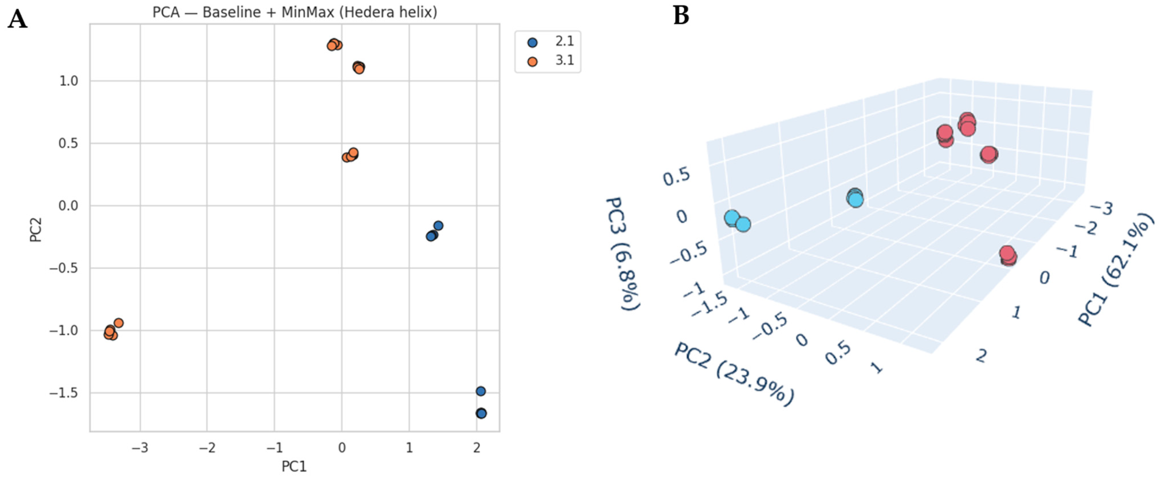 Figure 5). The two-dimensional PCA score plot (PC1 vs. PC2) reveals a clear separation between locations 2.1 and 3.1. PC1 explains 62.1% and PC2 23.9% of the variance, together capturing over 86% of the spectral information. The three-dimensional PCA projection (PC1–PC3) further illustrates this separation, with PC3 (6.8%) adding minor discriminative information. Samples from location 2.1 cluster more tightly, while those from location 3.1 are more dispersed, indicating greater internal variability.