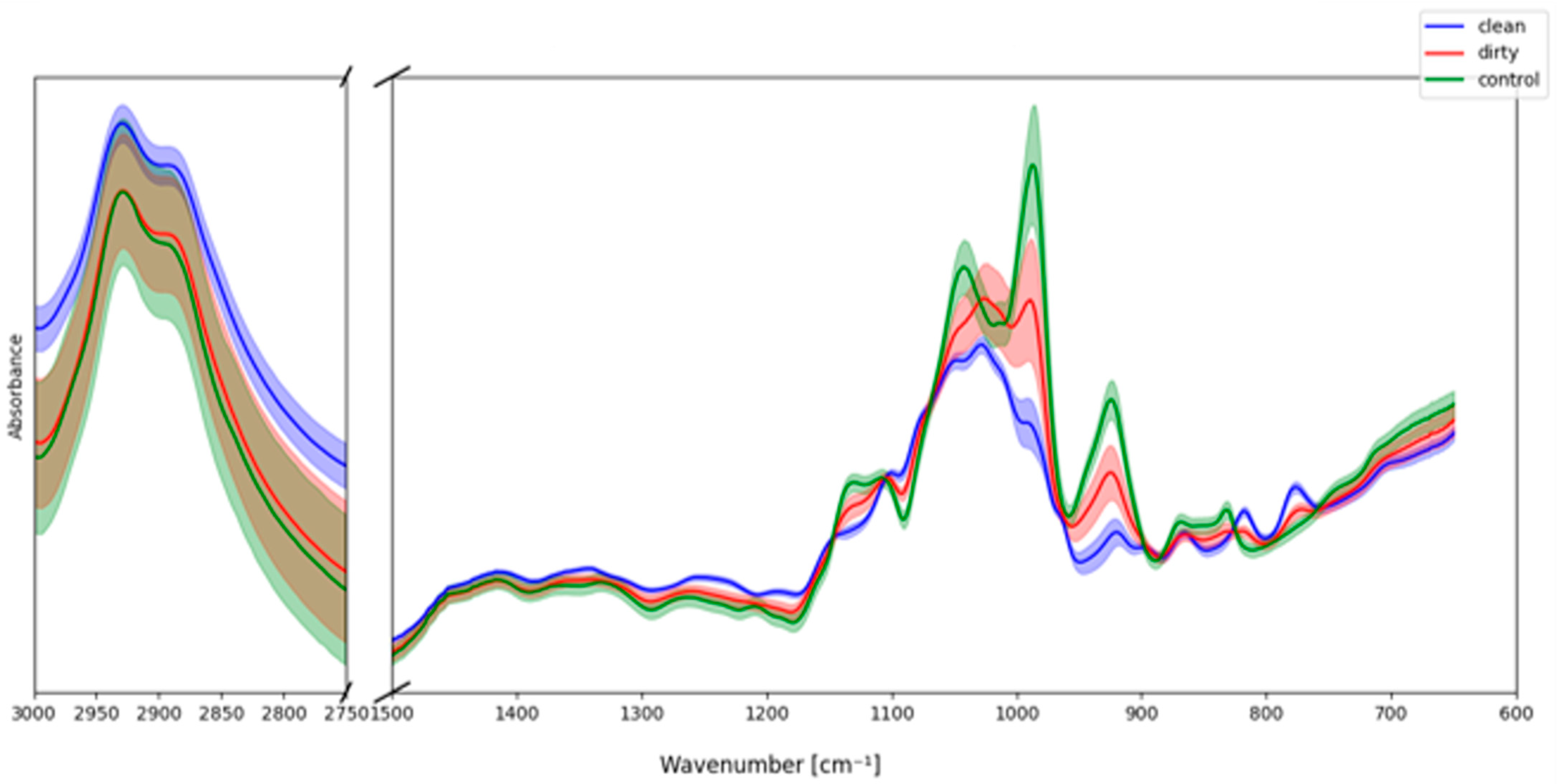 Differences were also evident in the C–H stretching region (2750–3000 cm−1). While both CLEAN and control spectra showed typical carbohydrate-associated bands, the DIRTY samples displayed lower intensity and a flatter profile, consistent with environmental modifications or interference. These observations suggest that exposure to different environments can result in detectable chemical signatures in nectar-like matrices, affecting both band intensities and reproducibility.
