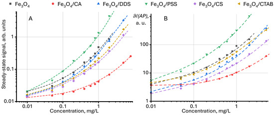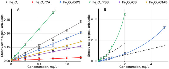 Effect of the concentration of modified magnetite nanoparticles in an aqueous dispersion on the steady-state signal (Equation (7)): (A) for a concentration of up to 1 mg/L; (B) for Fe3O4/PSS and Fe3O4/DDS samples (n = 3).