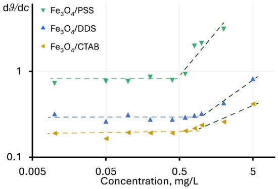 In the explicit form, similar changes are observed for Fe3O4 dispersions modified with PSS, DDS, and CTAB, when using the dependence of the ratio of the change in the steady-state signal to the change in concentration on the concentration dϑ/dc vs. c, as shown in Figure 2. In this case, the value of dϑ/dc for the linear section of the function ϑ = f(c) is constant, and the change in dϑ/dc indicates a violation of linearity. In this case, the highest deviation is observed for Fe3O4/PSS, and the lowest for Fe3O4/CTAB. For unmodified NPs and particles modified with chitosan and citric acid, no violations of linearity are observed in the concentration ranges used.