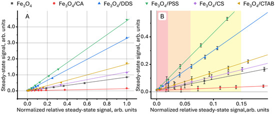 Dependence (A) of the steady-state signal (Equation (7)) on the relative steady-state signal (Equation (1)), normalized in the range 1÷0 for aqueous dispersions of magnetite nanoparticles with different surface modifiers, in which the green rectangle is the initial section presented in detail in (B).