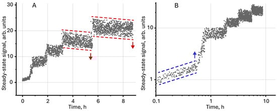 Unmodified magnetite nanoparticles are characterized by low colloidal stability and sedimentation resistance, which leads to aggregation and sedimentation of particles over time [59,102]. A decrease in the concentration of NPs due to their sedimentation reduces absorbance, which negatively affects the steady-state signal. In our case (Figure 5), on the contrary, an increase in the steady-state signal was detected over several hours of continuous photothermal measurements. The signal growth is accompanied by a sudden increase (Figure 5B). Such behavior for dispersed systems (as well as true solutions) has not been previously detected and, at first glance, contradicts the concepts described above. A possible justification for the observed effects may be the irreversible sorption of particles (or an ensemble of particles) on the walls of the cell in the laser transmission zone. Then, when the next particle is sorbed from the solution volume on the cell wall, the apparent absorbance of the solution increases and the steady-state signal grows.