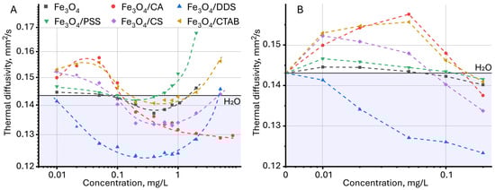 For dispersions of magnetite nanoparticles, the effect of NP concentration and modifier nature on thermal diffusivity was studied. First of all, it was noted that with increasing concentration for all the studied samples, a complex dynamic of thermal diffusivity change is observed, which can be divided into several stages (Figure 6A). At the first stage, in the concentration range up to 0.05 mg/L for all samples except Fe3O4/DDS, an increase in thermal diffusivity is observed, with highest for citric acid, CTAB, and chitosan. At the second stage, at a concentration from 0.05 to 0.4–0.6 mg/L, a significant decrease in thermal diffusivity occurs. At the third stage, at concentrations above 0.6–0.8 mg/L, the dynamics changes again and for all samples except Fe3O4/CA, and an increase in the thermal diffusivity of the dispersion is observed.