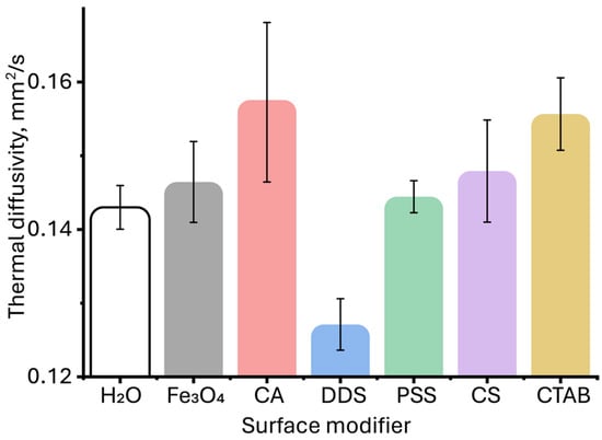 Thermal diffusivities of aqueous dispersions of magnetite nanoparticles with different surface modifiers at the same nanoparticle concentration of 0.05 mg/L. (n = 5).