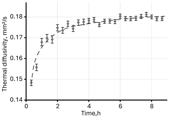 Long-term photothermal measurements of an aqueous dispersion of magnetite nanoparticles revealed a sharp increase in thermal diffusivity (Figure 8) during the first 2–3 h, followed by reaching an equilibrium, constant value.