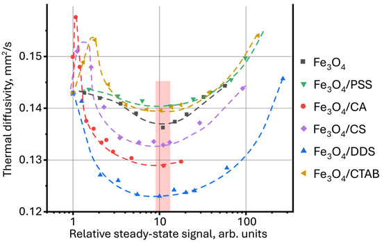 In this study, it is proposed to use thermal diffusivity as a function of the relative steady-state signal, found by Equation (1). (Figure 9). In this case, the thermal diffusivity for all samples reaches a minimum value at a relatively steady-state signal of ca. 10. It is important to note that the dynamics of changes in thermal diffusivity for all samples become the same, which was not observed when using the dependence D = f(c) in Figure 6A. This may result from the influence of thermooptical properties of nanoparticle surface modifiers, which, despite the differences, have the same magnetite core. Here, the NP surface modifier contributes to the value of thermal diffusivity, and the nature of magnetite in the general dynamics of changes in the thermal properties of dispersions.
