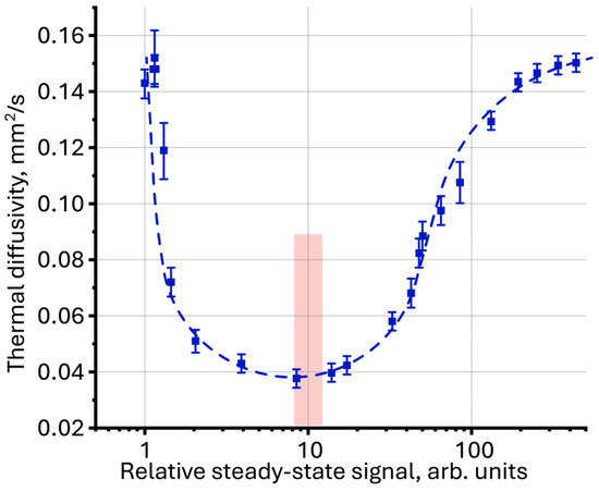 Thermal diffusivity as a function of relative steady-state signal (Equation (1)) for an aqueous dispersion of graphene oxide (fraction < 14 kDa, n = 3).
