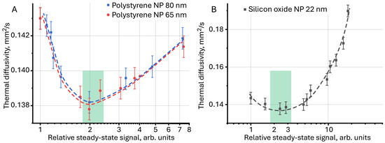 Thermal diffusivity as a function of relative steady-state signal for (A) aqueous dispersions of polystyrene nanoparticles and (B) for aqueous dispersions of silicon oxide (n = 5).