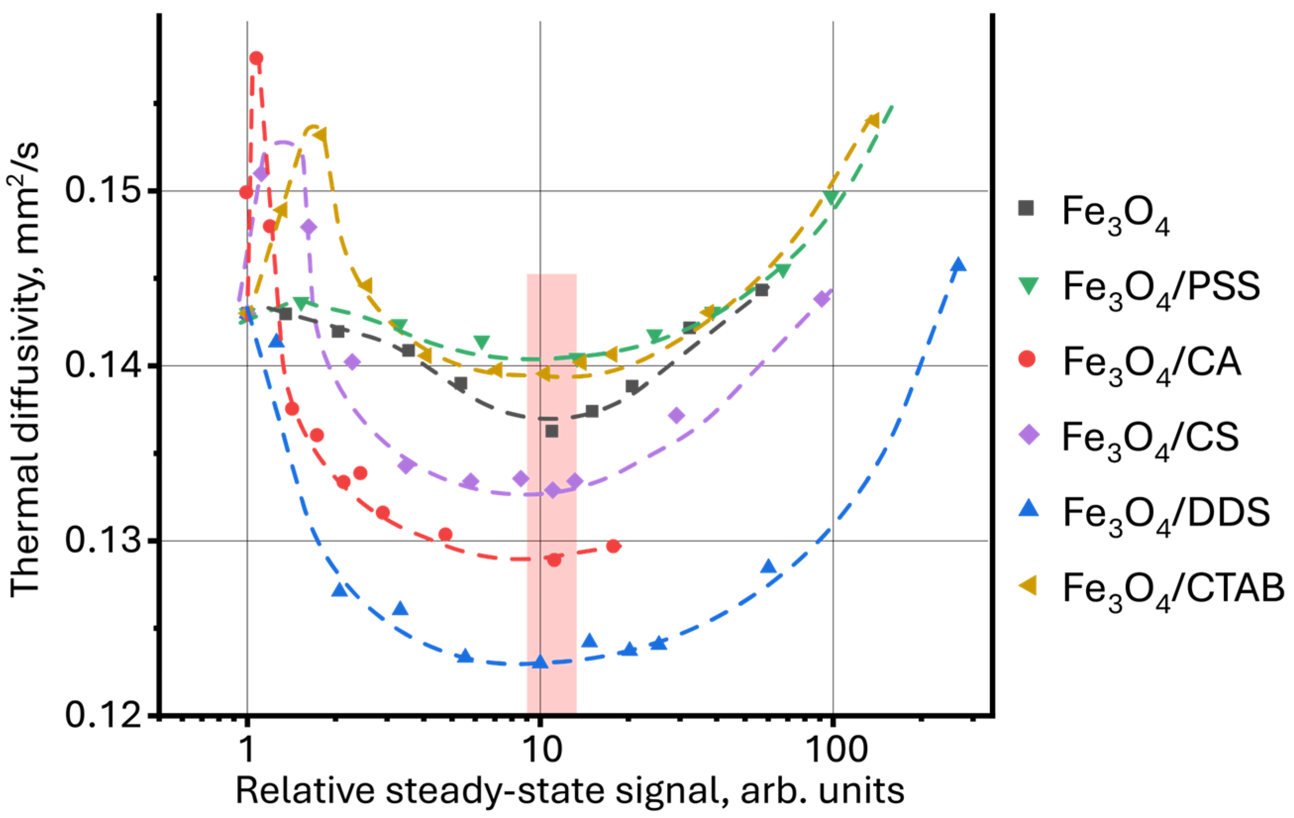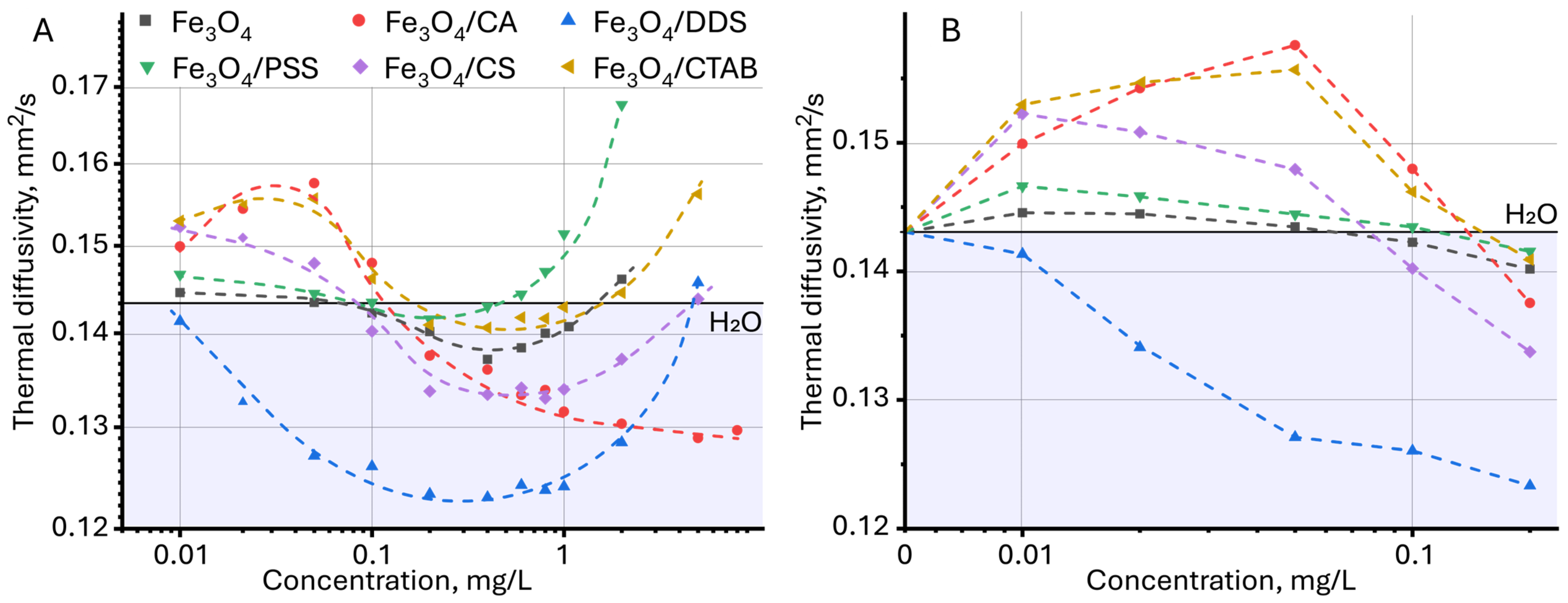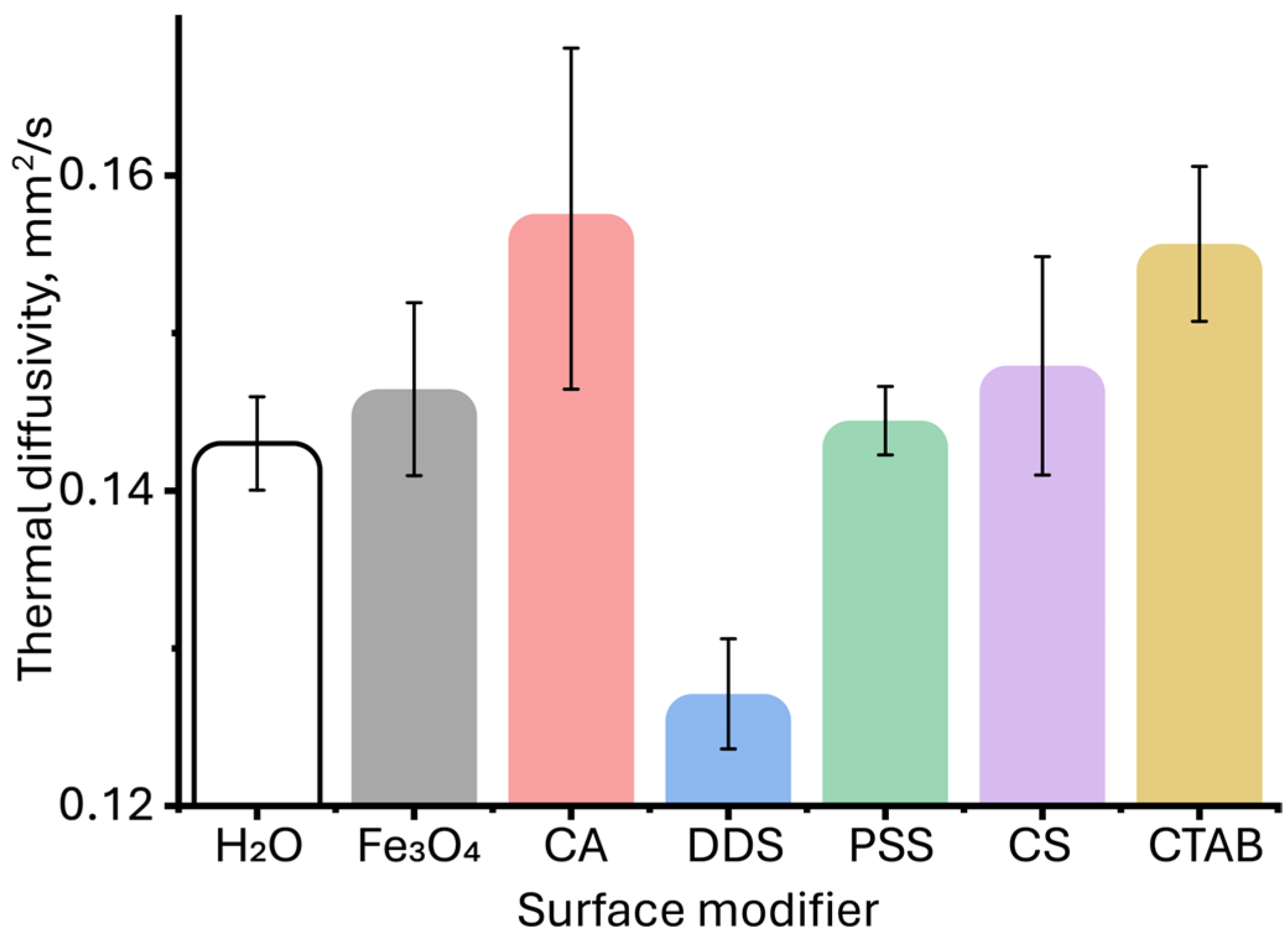 - Lenart, V.M.; Astrath, N.G.C.; Turchiello, R.F.; Goya, G.F.; Gómez, S.L. Thermal diffusivity of ferrofluids as a function of particle size determined using the mode-mismatched dual-beam thermal lens technique. J. Appl. Phys. 2018, 123, 085107. [Google Scholar] [CrossRef]