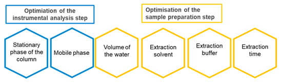 In the course of research, key stages of sample preparation for testing complex matrices of legume seeds with low water content and high protein content were optimised, and conditions for instrumental analysis were developed (Figure 1). The following factors were analysed: stationary and mobile phases, water volume, type of extraction solvent and buffer, and extraction time (Supplementary Table S1). The parameter used to assess the suitability of the procedure was recovery (Supplementary Table S2).
