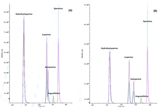 Over 16,000 alkaloids are known, including tropane alkaloids (TAs), quinoline alkaloids, isoquinoline alkaloids, quinolizidine alkaloids (QAs), indole alkaloids, pyrrolizidine alkaloids (PAs), purine alkaloids, imidazole alkaloids, pyridine alkaloids and piperidine alkaloids []. Pyrrolizidine alkaloids are mainly found in black and green tea leaves and herbs [], while tropane alkaloids are present in plant-based products such as flour, cereals, biscuits, cakes, bread, pasta, herbal teas and legumes []. Quinolizidine alkaloids are the most common and toxicologically significant alkaloids in leguminous plants. The main alkaloids of this group are angustifoline, sparteine, isolupanine, hydroxylupanine and lupanine []. In humans, QAs can inhibit acetylcholine receptors in both the central nervous system and the peripheral autonomic nervous system, which can cause respiratory failure and ultimately death. Acute poisoning with QAs presents as malaise, nausea, respiratory arrest, weakness and coma []. Despite this, the European Union (EU) has established maximum residue limits (MRLs) only for specific alkaloids (atropine, morphine, codeine, scopolamine, ergot and 21 PAs expressed as a sum) in selected matrices (cereals and cereal products, tea, dried herbs, poppy seeds and poppy seed products) [].