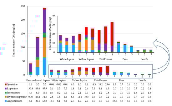 It is essential to accurately determine their content in plant material and food products due to their potential toxic effects []. To ensure high quality of leguminous plants, and due to the low content of certain QAs, selective and highly sensitive analytical methods should be used to monitor the levels of undesirable QAs. The problem with analysing QAs is due to their low water content and the presence of a number of interfering compounds (proteins, sugars and fats) that negatively affect the sensitivity and selectivity of the method []. Liquid chromatography with tandem mass spectrometry (LC–MS/MS) is the most commonly used method for the identification and quantitative determination of QAs [,,,], less commonly ultra-high performance liquid chromatography coupled with quadrupole time-of-flight mass spectrometry (UHPLC–QTOF–MS) [], gas chromatography (GC) with mass spectrometry (MS) [] or with a flame ionisation detector (FID) [].