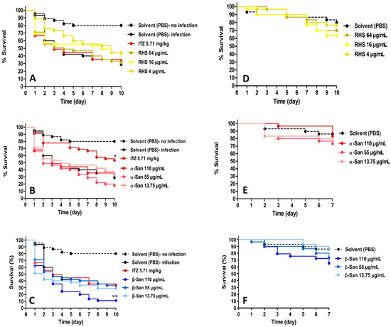 Kaplan–Meier survival curves of Galleria mellonella larvae over 7–10 days. (A–C) Dotted lines indicate uninfected larvae which served as solvent controls and which were treated with PBS. The solid lines indicate infected larvae treated with 20 µL of the test substances at the mentioned concentrations at 4, 28, and 52 h post-infection. (D–F) Toxicity to uninfected larvae. Dotted lines: uninfected larvae as solvent controls, treated with PBS; Solid lines: uninfected larvae treated with 20 µL single dose of the test substances in the mentioned concentrations. (A,D) RHS = Royal Hawaiian sandalwood EO; (B,E) (Z)-α-santalol; (C,F) (Z)-β-santalol; ITZ: itraconazole. * p < 0.05; ** p < 0.01.