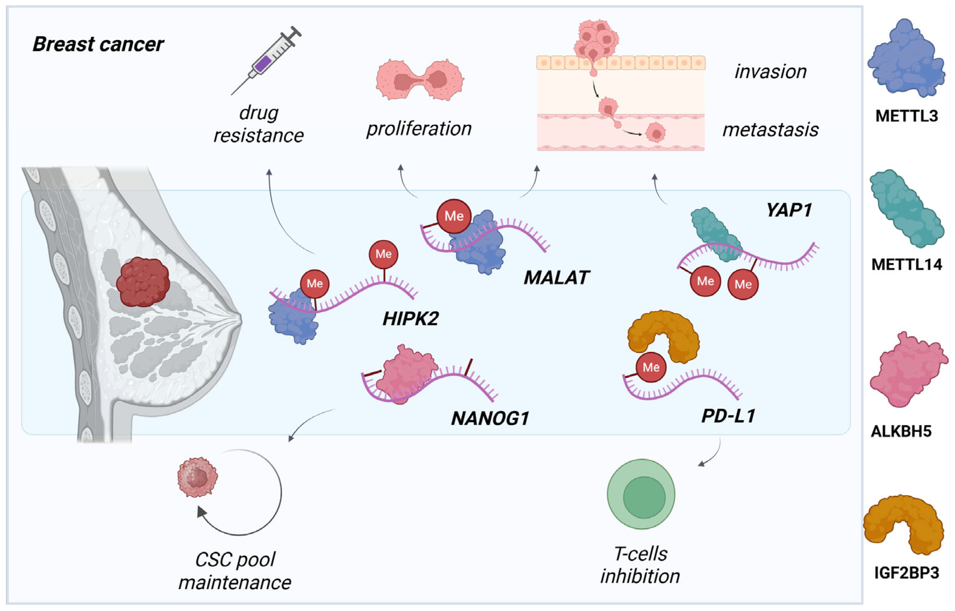 METTL3/14 | STM2457 | Competitive inhibitor | TNBC | Decrease in cancer metastasis on the xenograft model in vivo; ↑ drug sensitivity; | [74] |
