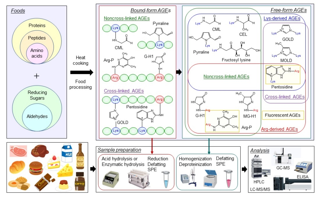The accumulation of exogenous d-AGEs derived from food and endogenous AGEs produced in the body poses various health risks, and therefore it is important to reduce them. Particularly, AGEs in food, due to their ease of formation and the large quantities produced, are problematic when consumed in excess. However, as long as AGE precursors are always present in food, completely suppressing AGE formation during cooking and processing remains difficult. Furthermore, the Maillard reaction responsible for AGE formation is also involved in sensory qualities like flavor. Therefore, it is necessary to minimize AGE formation without sacrificing these qualities. The amount of AGEs formed in food depends on food components, storage methods, processing methods, and processing conditions. Therefore, it is necessary to control these factors and monitor AGEs levels in food, and to evaluate the intake of AGEs from these foods and their health effects. However, because multiple foods with varying AGEs levels are consumed simultaneously, accurately determining AGEs intake is difficult, and current understanding of the effects of AGEs intake at different levels is insufficient. Furthermore, it is not fully understood which of the various AGEs formed are more toxic, and therefore, a tolerable daily intake has not been established. Therefore, an urgent priority is to clarify the relationship between dietary AGEs intake and its adverse effects on human health, and to establish clear safety guidelines for consuming AGEs-containing foods.