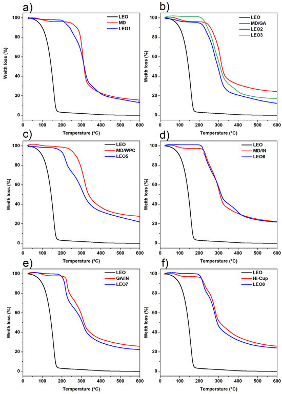 TGA curves of LEO, the used carriers and the microcapsules containing lavandin essential oil: (a) MD-Maltodextrin; (b) MD/GA-Maltodextrin/Gum arabic = 1:1 (w/w); (c) MD/WPC-maltodextrin/Whey protein concentrate = 1:1 (w/w); (d) MD/IN-Maltodextrin/Inulin = 1:1 (w/w); (e) GA/IN-Gum Arabic/Inulin = 1:1 (w/w); (f) Hi-Cup-Modified starch.