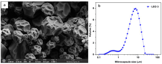 The morphological characteristics of the LEO3 microcapsules are shown in Figure 3a. As can be seen, the obtained LEO3 microparticles were semi-spherical and wrinkled, with dents but no cracks on the particle surface. The high inlet temperature and rapid evaporation through the wall material during particle formation may cause the irregular surface of the microcapsules [48]. The wrinkled surface of the particles can be helpful for some powder applications, as it allows better dispersibility and rehydration of the particles [49]. On the other hand, the presence of fractures, cracks, and defects on the surface of the microcapsules is not desirable, as they can lead to oxidation and degradation of the encapsulated essential oil [50].
