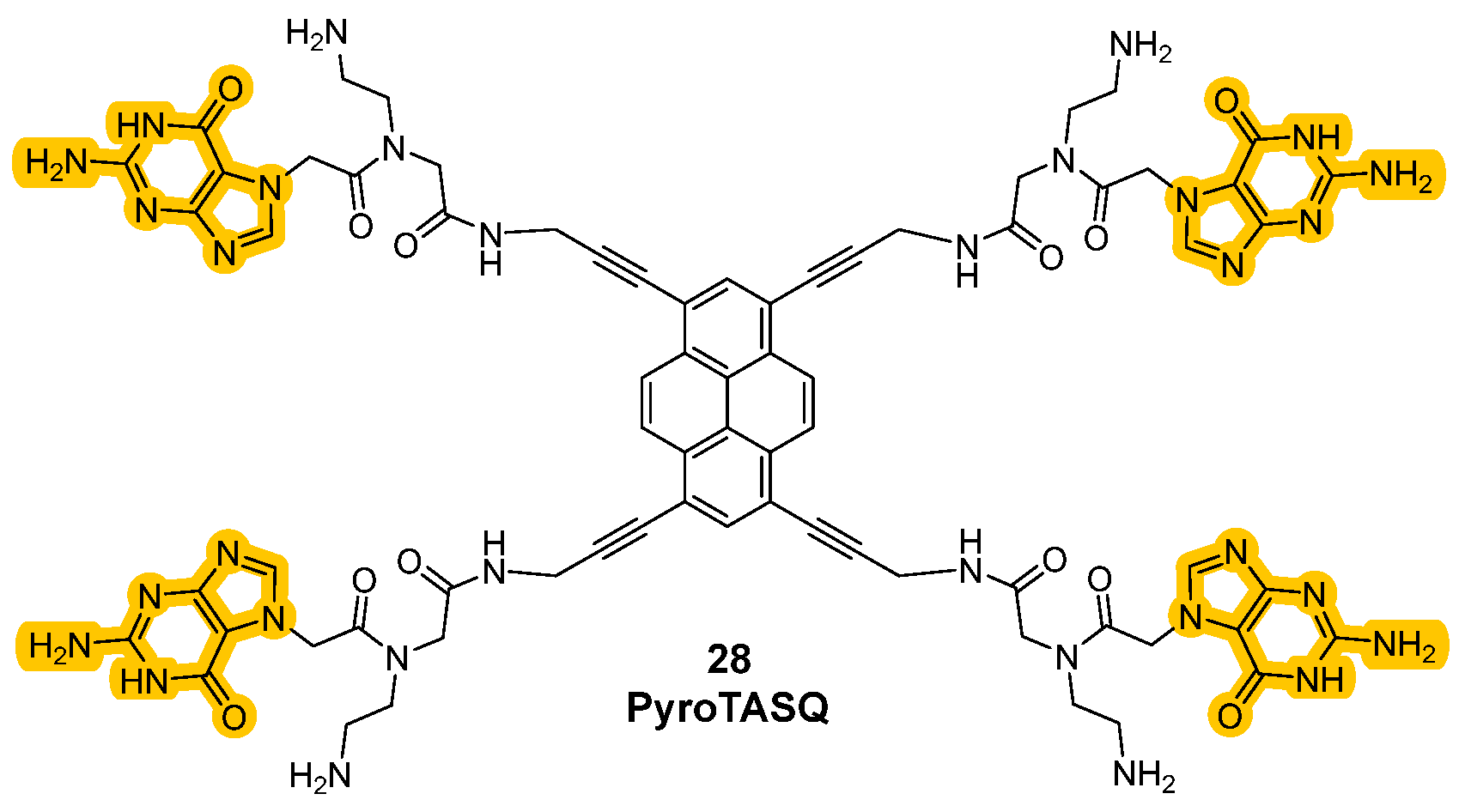 - Laguerre, A.; Stefan, L.; Larrouy, M.; Genest, D.; Novotna, J.; Pirrotta, M.; Monchaud, D. A Twice-As-smart synthetic G-quartet: PyroTASQ is both a smart quadruplex ligand and a smart fluorescent probe. J. Am. Chem. Soc. 2014, 136, 12406–12414. [Google Scholar] [CrossRef]