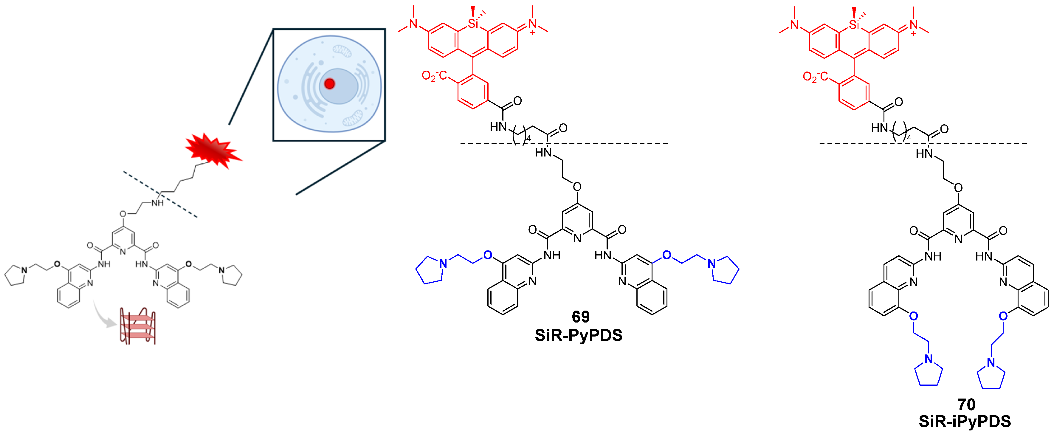 - Han, J.; Li, J.; Luo, X.; Feng, G.; Zhang, J. Developments in near-infrared fluorescent probes for G-quadruplexes structures. Co-ord. Chem. Rev. 2024, 520, 216157. [Google Scholar] [CrossRef]