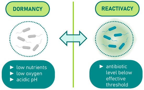 The bulk of antibiotic classes in use today were identified during the “golden era” of antibiotic discovery, which occurred between the 1940s and 1980s [1]. During this period, screening efforts focused on compounds capable of inhibiting or killing rapidly dividing bacteria. Consequently, most antibiotics from this era are designed to interfere with crucial bacterial growth processes, such as the synthesis of proteins, peptidoglycan, folic acid, DNA, and RNA [4]. As bacterial resistance to these antibiotics emerged, chemical modifications were applied to existing drug classes to develop analogues with improved potency. These analogues, much like their predecessors, primarily target metabolically active, fast-replicating bacteria. However, in certain infections, bacteria may encounter hostile environments that push them into a quiescent state characterized by minimal or no growth. These metabolically dormant bacteria are capable of surviving high antibiotic concentrations, necessitating prolonged treatment for efficacy [5,6,7,8,9]. Once antibiotic levels drop below the threshold required to kill or inhibit these cells, the dormant bacteria can reactivate, leading to a recurrence of symptoms. Provided that these reactivated bacteria have not developed genetic resistance, subsequent treatment cycles can eliminate them. The shift from active division to dormancy in bacterial cells is complex and often triggered by environmental stresses, such as nutrient and oxygen shortages, and acidic pH, which collectively slow down or halt bacterial growth (as shown in Figure 1).