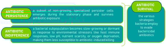 Antibiotic resistance is a significant contributor to treatment failures [22]. Beyond genetic resistance, pathogenic bacteria often undergo physiological changes that slow or halt their growth, making them difficult to eradicate with bactericidal antibiotics, despite not having developed genetic resistance [23]. These bacteria can regain antibiotic sensitivity once growth resumes. This recalcitrance to treatment arises from two key phenomena: ‘antibiotic persistence’ and ‘antibiotic indifference’ [24,25,26]. Together, these phenomena, are referred to as ‘antibiotic survival,’ and have been illustrated in Figure 2. Antibiotic survival (as used here) denotes non-inherited phenotypes that allow bacteria to avoid killing by bactericidal antibiotics during exposure and later regain susceptibility upon resumption of growth. We highlight two major states: persistence, a specialized non-growing subpopulation that survives lethal exposure [27,28], and indifference, a stress-imposed slow-growth/dormant state (e.g., host responses, low pH, nutrient or oxygen limitation) that reduces antibiotic-induced killing without genetic resistance [29,30]. As framed by Hurdle et al. and O’Neill [31,32], these non-genetic states are key contributors to treatment recalcitrance.