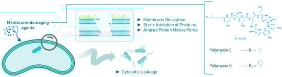 Membrane-damaging agents often exhibit a complex mode of action, targeting multiple cellular components. These agents can disrupt membrane architecture and functional integrity through the interaction of their lipophilic moieties with the bacterial membrane, sterically inhibit membrane-embedded proteins, or alter the proton motive force, potentially leading to cytosolic content leakage and cell death [42,43,44]. These disruptions can have lethal, pleiotropic effects on quiescent bacteria, as shown in Figure 3.