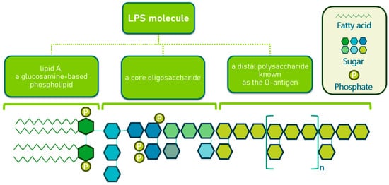 In most Gram-negative bacteria, the OM is an asymmetric bilayer composed of phospholipids and lipopolysaccharides (LPS), the latter being exclusively located in the outer leaflet. A typical LPS molecule consists of three components as shown in Figure 4 [51,52]. The inner leaflet of the OM closely resembles the cytoplasmic membrane, containing about 80% phosphatidylethanolamine, 15% phosphatidylglycerol, and 5% cardiolipin [53]. In mutants with altered LPS structures, phospholipids may also be found in the outer leaflet, likely due to a reduction in OM protein levels. The OM is populated by various proteins, some of which are extremely abundant. For instance, murein lipoprotein (Lpp) and outer membrane protein A (OmpA) are present at around 100,000 copies per cell [54]. Lpp is anchored in the OM by a fatty acid moiety, and a portion of Lpp is also covalently attached to the peptidoglycan layer, suggesting a role in maintaining OM integrity [55]. Mutants lacking Lpp produce OM vesicles and lose periplasmic enzymes. OmpA, another abundant protein, is believed to contribute to cell shape, and its absence, along with Lpp, compromises cell structure. OmpA also has pore-forming properties, though with low permeation efficiency, and recent evidence suggests it may exist in two conformations: a monomeric β-barrel and an oligomeric form with large open β-barrels, similar to general diffusion porins like OmpF [55]. Beyond general diffusion porins, the OM includes specialized channels and receptors for the uptake of specific substrates, proteins involved in OM biogenesis, and enzymes such as the OmpT protease in E. coli [56]. These components are crucial for various cellular functions, including LPS assembly and the formation of surface appendages like pili and flagella.