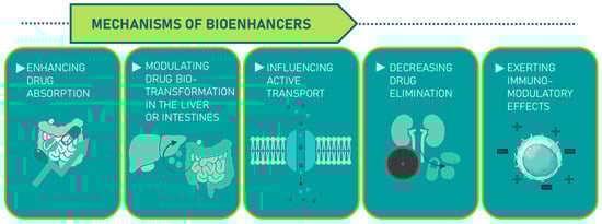 Bioenhancers can function through various mechanisms: enhancing drug absorption, modulating drug biotransformation in the liver or intestines, influencing active transport, decreasing drug elimination, or exerting immunomodulatory effects (Figure 5) [58].
