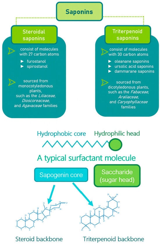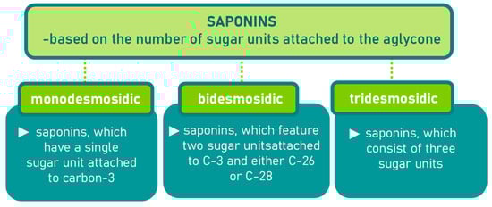Saponins are a class of secondary metabolites produced by certain plants, some insects and marine organisms. The term “saponin” originates from the Latin word “sapo,” meaning soap, which reflects their ability to form a stable, soap-like foam when an aqueous solution of saponins is vigorously shaken [86]. Saponins can be extracted from various parts of a plant, including roots, leaves, fruits, pericarps, flowers, and seeds. The composition and concentration of saponins can vary not only between different plants but also among different parts of the same plant [87,88]. These variations in saponin content are influenced by environmental factors during the plant’s development, as well as the methods used for extraction. Saponins are naturally occurring amphiphilic glycosides, characterized by their structure, which includes polar glycone components (sugar moieties) and nonpolar aglycone components (sapogenins) [87,88]. These compounds are categorized based on the type of aglycone they contain into two main groups: steroidal saponins and triterpenoid saponins as shown in Figure 6. Saponins are also categorized based on the number of sugar units attached to the aglycone (Figure 7). The sugar chains attached to the aglycone can be either branched or linear, typically comprising D-glucose, D-galactose, L-arabinose, L-rhamnose, D-xylose, D-fucose, and glucuronic acid [89].