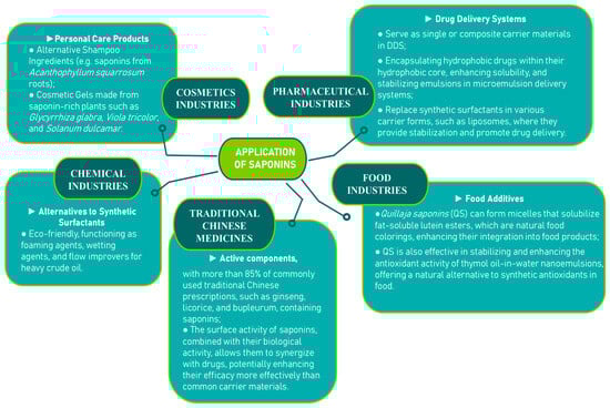 Due to the combination of lipophilic aglycones and hydrophilic sugar chains, saponins function as natural surfactants, making them potential substitutes for chemical surfactants. Beyond this, saponins have a wide range of applications, including in the pharmaceutical, food, and cosmetic industries [87] (Figure 8).