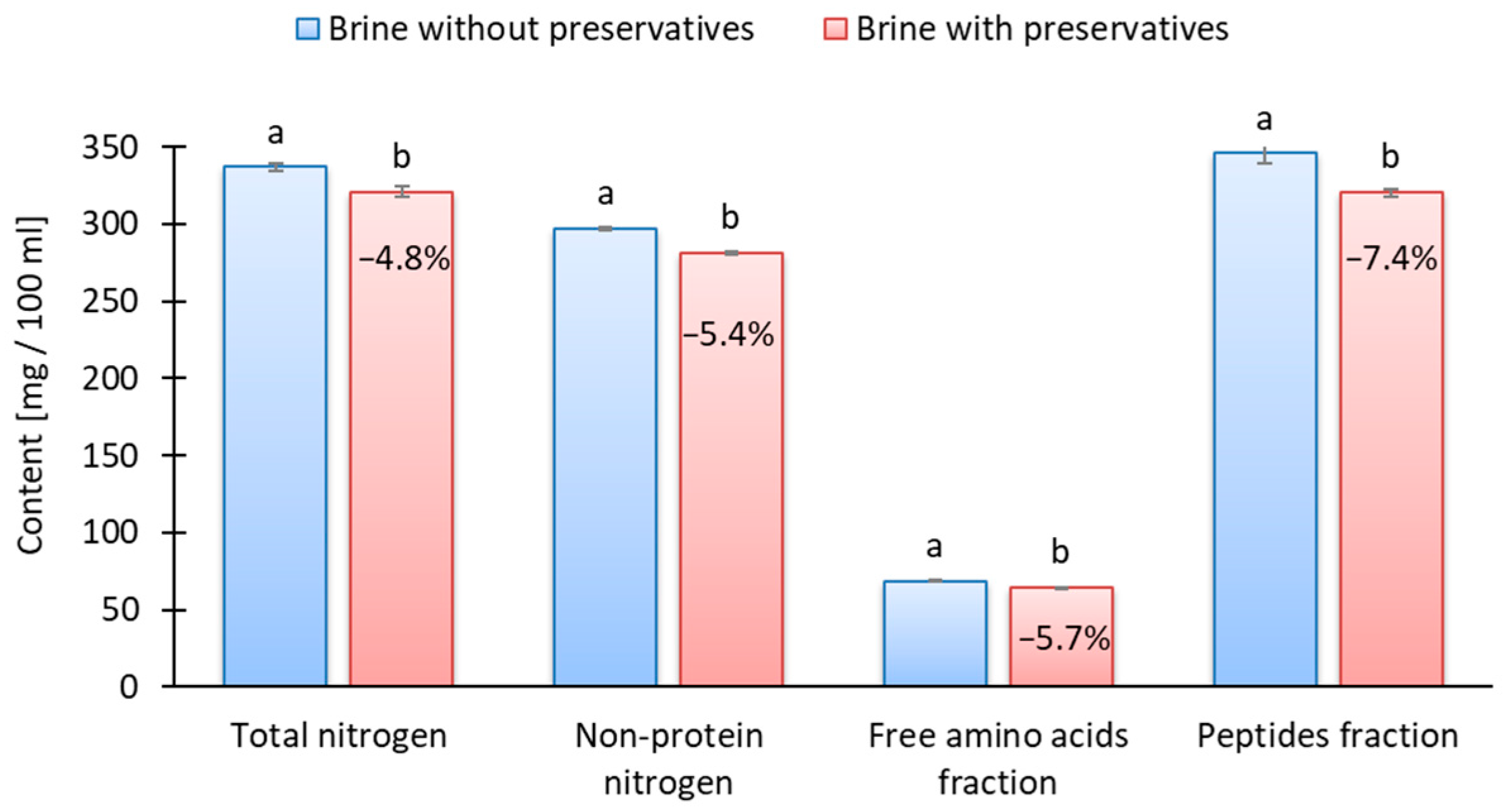 NPN [mg/100 g] | 235 ± 8.2 a,* | 254.2 ± 13.0 a | 246.9 ± 8.3 a | −2.9 |