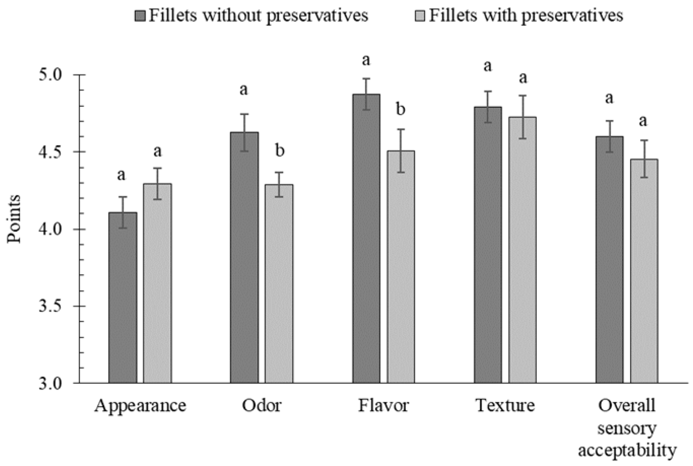 Analysis | Raw Fillet | Marinades—No Preservatives | Marinades—With Preservatives | Difference [%] |