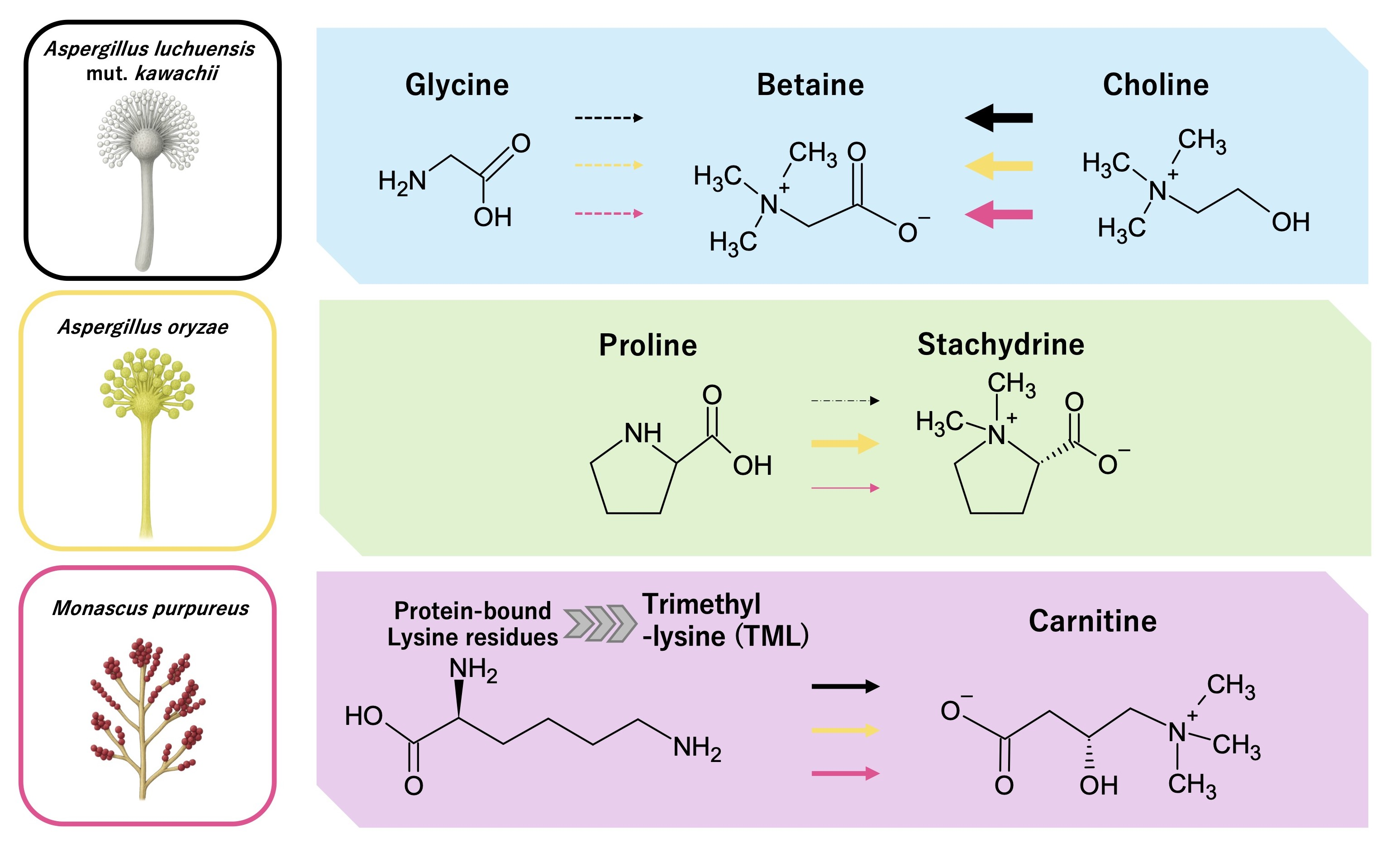 A. oryzae markedly produced three kinds of betaine structural analogs—namely betaine, stachydrine, and carnitine [