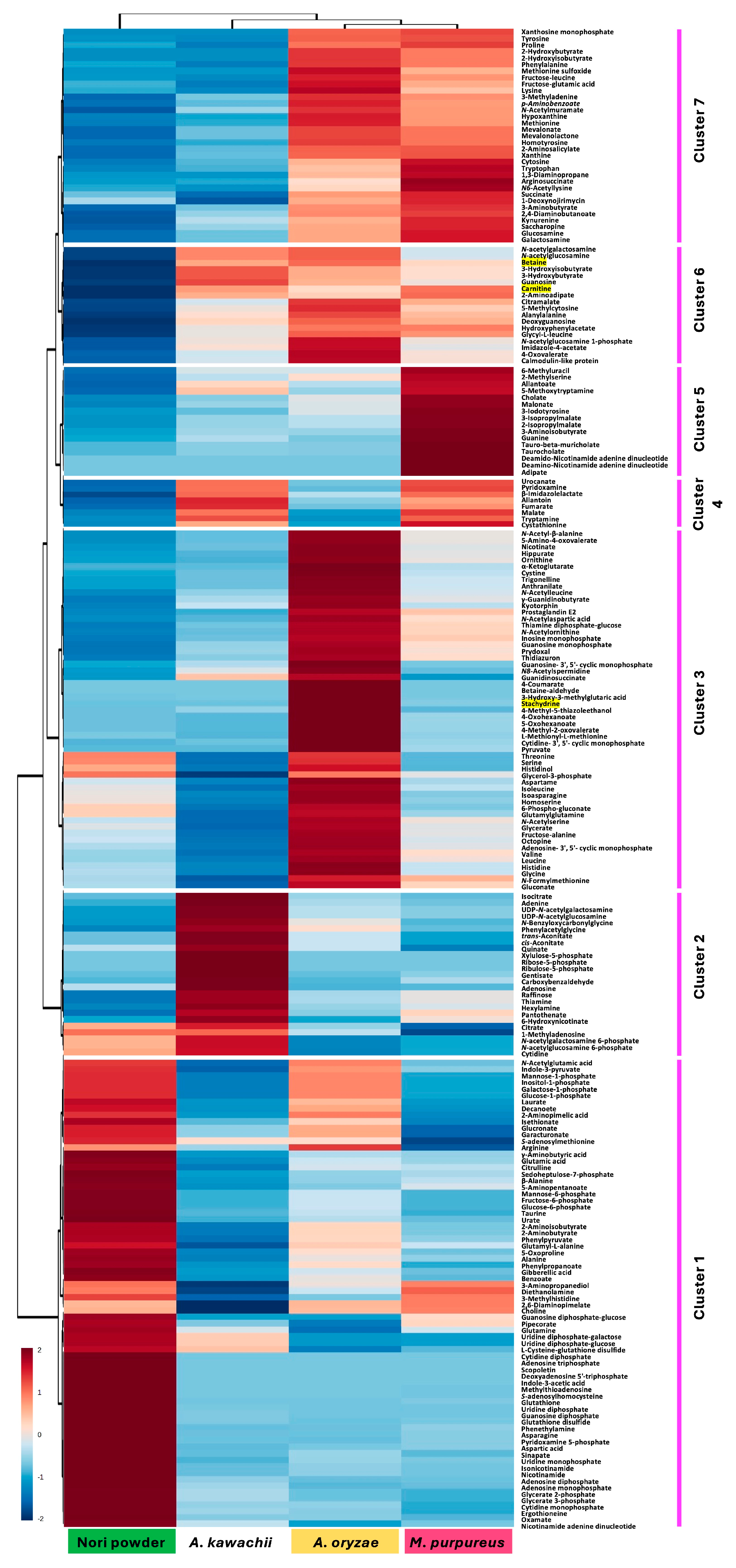 The molecules that increased characteristically in AK (white koji fungus) were classified into Cluster 2, including xylulose-5-phosphate, ribose-5-phosphate, and ribulose-5-phosphate (indicating activation of the pentose phosphate pathway), UDP-N-acetylglucosamine (UDP-GlcNAc) and UDP-N-acetylgalactosamine (UDP-GalNAc) (hexosamine pathway), citrate, cis- and trans-aconitate, and isocitrate (TCA cycle with citric acid accumulation), gentisate and quinate (aromatic compound degradation), 6-hydroxynicotinate (nicotinic acid degradation), and adenosine and adenine (nucleotide metabolism). These changes likely represent a metabolic adaptation that enables the white koji fungus to create an acidic environment and efficiently decompose and utilize sugars and aromatic components derived from seaweed powder.