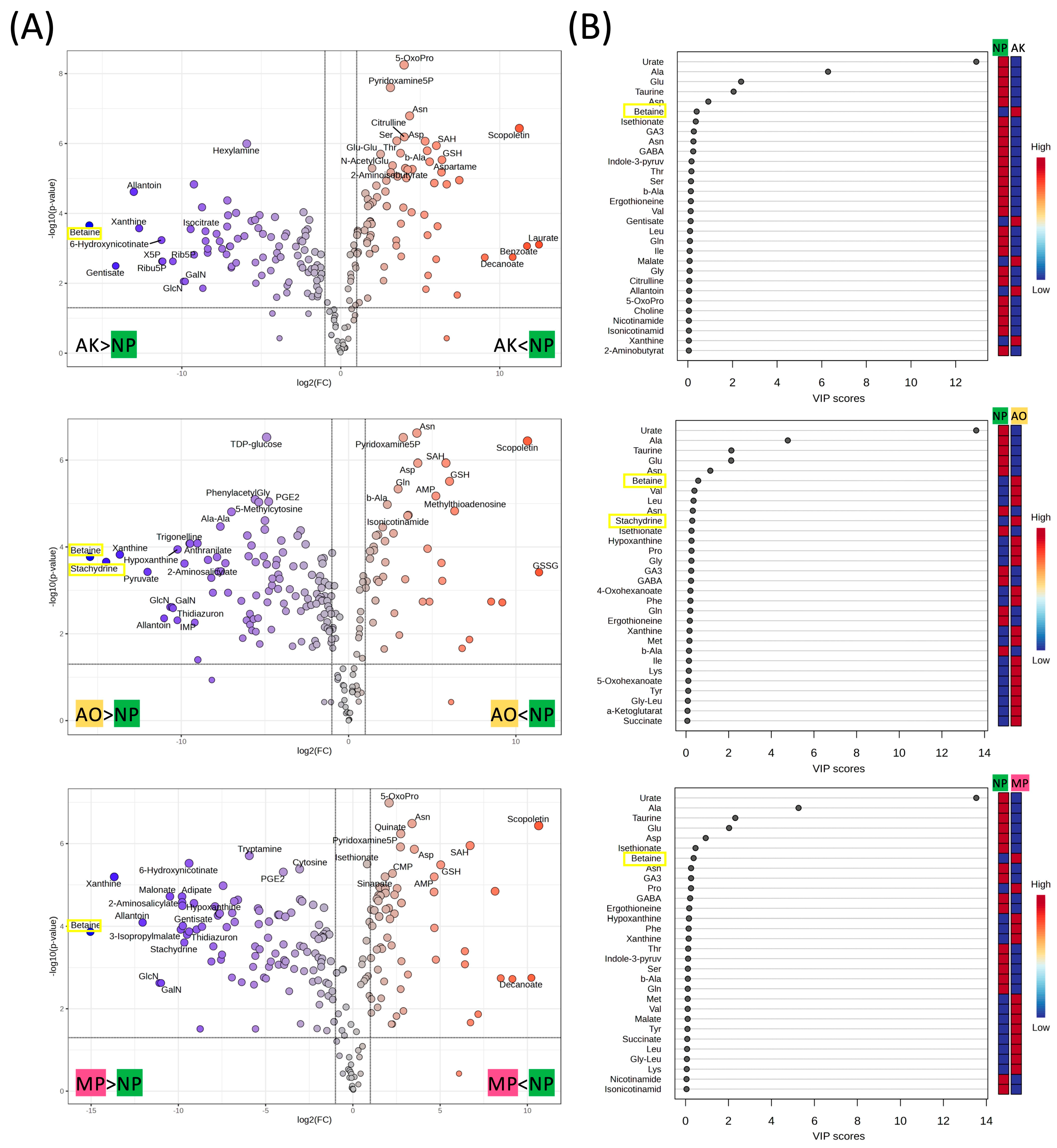 These patterns suggest that AO not only activates the choline oxidation pathway but also expands the glycine/serine/threonine pools, whereas AK relies on rapid choline-to-betaine conversion with minimal glycine involvement, and MP maintains intermediate levels of both choline and glycine-related precursors.