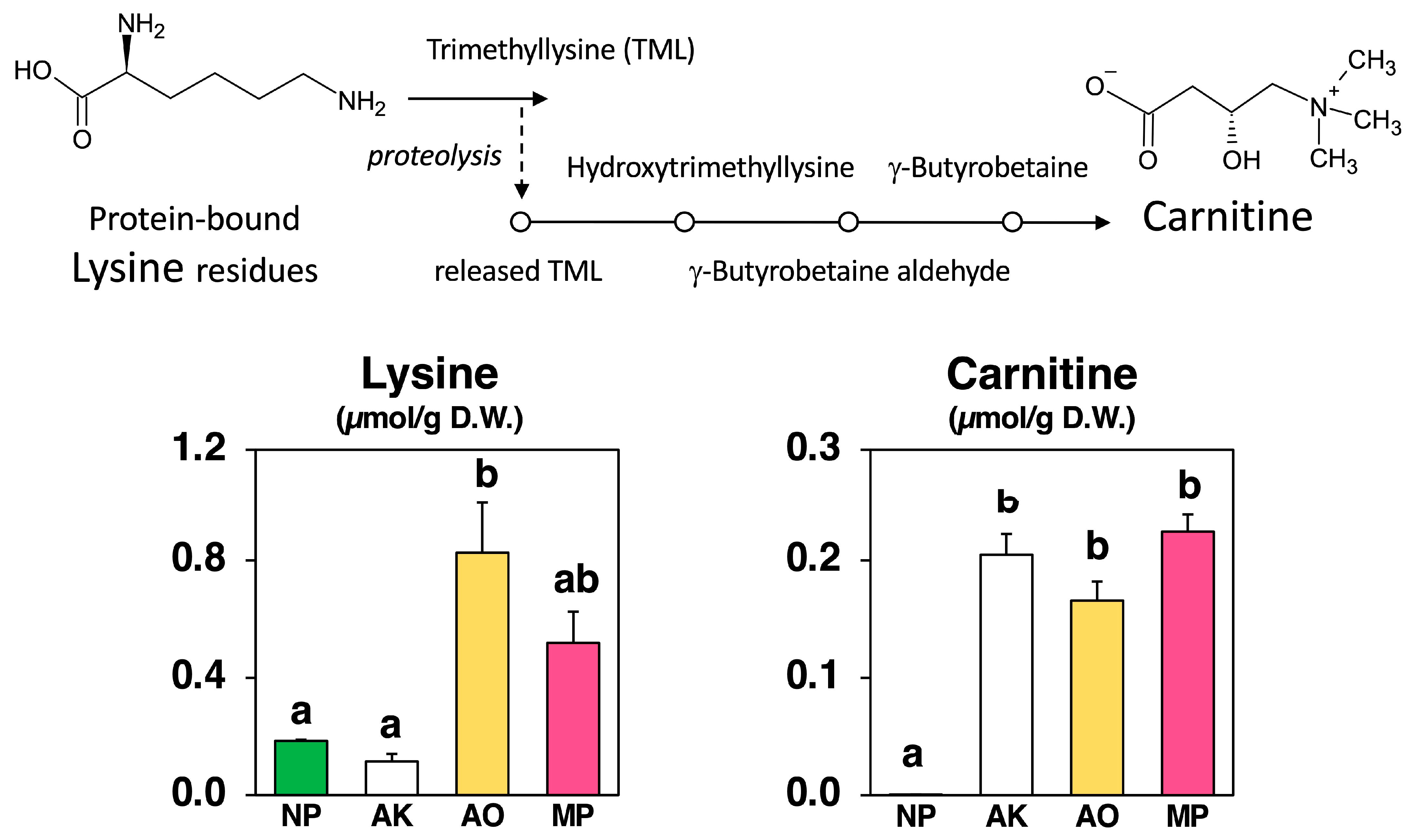 Figure 6, carnitine, also known as γ-trimethyl-β-oxybutyrobetain, which is derived by methylating the amino acid lysine, was slightly detected (0.00056 µmol/g) in Nori powder prior to fungal fermentation. Carnitine levels increased consistently across all fermented groups relative to NP, reaching 0.205 µmol/g in AK, 0.166 µmol/g in AO, and 0.224 µmol/g in MP.