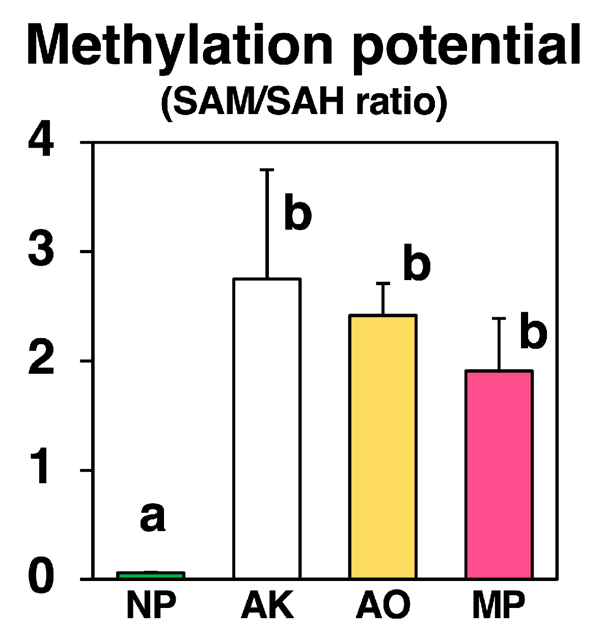 The SAM/SAH ratio, an indicator of methylation capacity, increased dramatically after fungal fermentation compared with that in non-fermented Nori. NP showed a low ratio of 0.060, whereas all koji-fermented samples showed markedly elevated ratios: 2.75 in AK, 2.42 in AO, and 1.91 in MP.