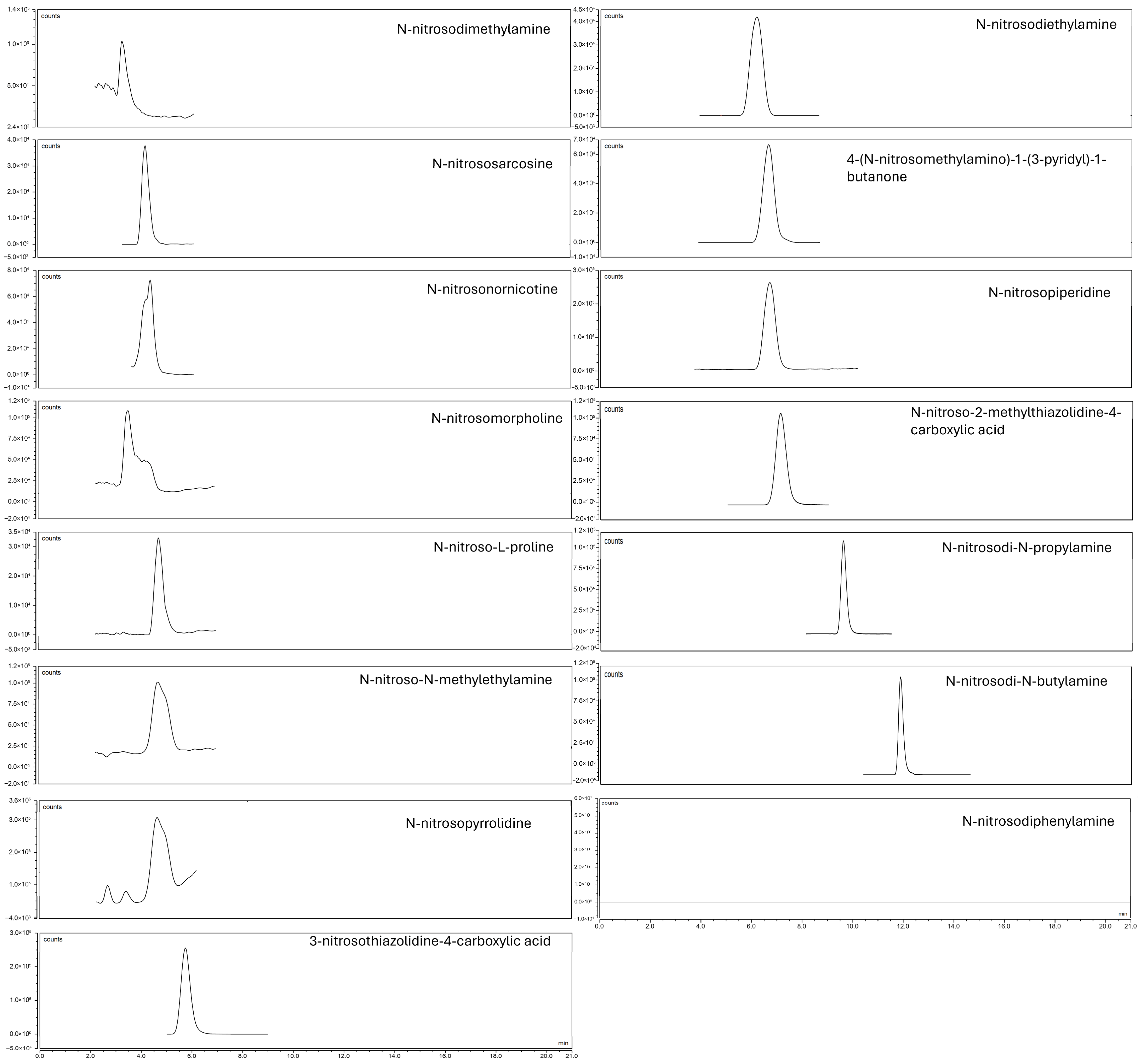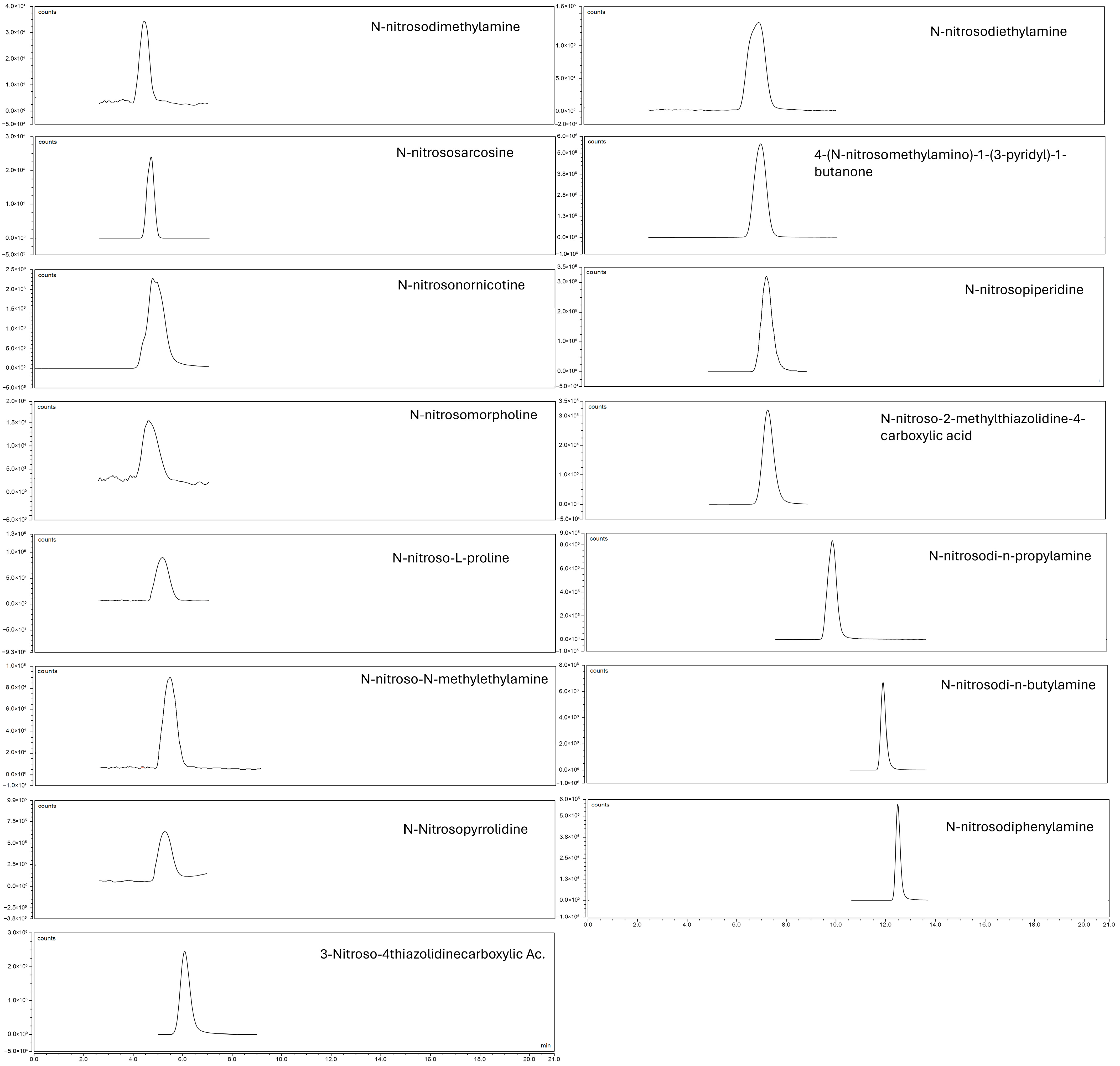 | N-Nitrosodiethylamine | N-Nitrosodimethylamine | N-Nitrosodi-n-Butylamine | N-Nitrosodi-n-Propylamine | N-Nitrosopiperidine | N-Nitrosopyrrolidine | N-Nitrosomorpholine | SUM | ||