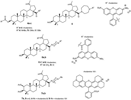 Recently, in continuation of these studies, the authors of work [27] obtained new conjugates of 2,3-diacetyloxybetulinic acid with rhodamines B and 101, in which a piperazine linker was also used to join the target fragments. Hybrids 7a,b demonstrated the highest cytotoxic activity against A2780 tumor cells (IC50 = 0.016 and 0.019 μM, respectively). These compounds in contrast with their analogs 6 exhibited high selectivity for A2780 cells compared to normal fibroblasts NIH 3T3. Cell cycle studies on A375 melanoma cells showed that conjugates 7a,b inhibit cell division in the G1/G0 phase. Using flow cytometry with Annexin V-FITC/PI staining, it was established that the effect of compounds 7a,b causes both necrosis and apoptosis of tumor cells.