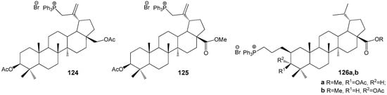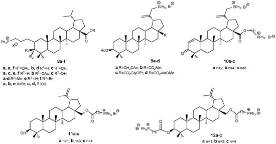 Triphenylphosphonium derivatives of BE and BA induce tumor cell apoptosis via mitochondrial damage, due to their positively charged, lipophilic Ph3P+ fragment. Unlike rhodamine, these conjugates are less toxic to normal cells [28,29,30]. Modifying the lupane platform in this way has proven highly effective. Since the initial report in 2013 [28] detailing the synthesis of triphenylphosphonium conjugates 8af (Figure 4), derived from BA esters, over 730 publications have explored the synthesis and antitumor characteristics of compounds bearing Ph3P+ substituents linked to the lupane core structure either directly or via various linkers at positions C-3, C-28, and C-30. The hybrids 8af exhibited cytotoxic activity against P-815 and Ehrlich tumor cells, with IC50 values ranging from 1.1 to 4.7 μM; in comparison, BA demonstrated IC50 values of 41 and 54 μM for these cell lines, respectively. Additionally, subsequent work by the same authors [29] described compounds 9ad, 10ac, which displayed cytotoxicity approximately ten times greater than that observed with BA.