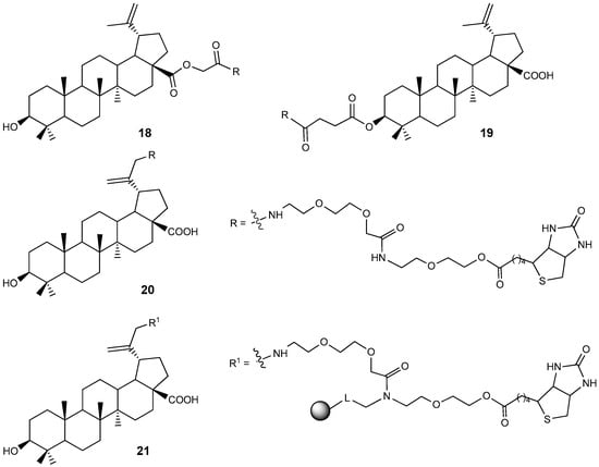 Various BA conjugates with biotin attached at the 3-C, C-28, and C-30 positions via a PEG linker have been synthesized [34]. The cytotoxicity of compounds 1821 (Figure 7) was evaluated on CCRF-CEM and HCT116 tumor cell lines. Conjugate 18 exhibited an IC50 value of 14.85 µM, which is approximately twice as active as BA 1 (IC50 = 30.0 µM) against human leukemic lymphoblasts (CCRF-CEM cells).