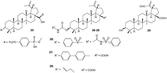 Abdel Bar FM et al. synthesized several BA analogues (Figure 9) and evaluated their inhibitory activity on topoisomerase I and IIA. Compounds 25, 26, and 29 exhibited topoisomerase I inhibitory activities like or exceeding those of camptothecin, a known anticancer drug. Additionally, BA derivatives 2528 demonstrated approximately 1.5 times higher activity than etoposide in topoisomerase IIA assays and showed increased cytotoxicity against human colon cancer cell lines SW948 and HCT-116 as well as the breast cancer cell line MDA-MB-231, when compared with the parent acid. Structure-activity relationship analysis indicated that aromatic or olefinic substitutions at the C-3 position of the lupane scaffold significantly enhanced binding affinity for both topoisomerase types. In contrast, oxidation of the isopropenyl side chain to an aldehyde 29 produced moderate inhibitory activity against topoisomerase I, without substantially affecting the binding affinity for topoisomerase IIA [38].