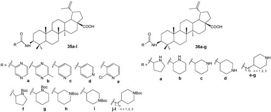 The literature provides extensive information on the synthesis and antitumor properties of conjugates formed from lupanoids and nitrogen-containing heterocycles. The heterocyclic fragment may be attached to the lupane structure via an amide or ester bond at functional groups located at the C-2, C-3, or C-28 positions, as well as through various linkers, or may form fused systems. Compound 35l (Figure 11) demonstrated the highest activity against the proliferation of eight non-drug-resistant and one multidrug-resistant tumor cell lines among the hybrids with different heterocyclic substituents at the C-3 position. The cytotoxicity (IC50 = 0.33–2.45 µM) observed in the multidrug-resistant human breast cancer cell line (MCF-7/ADR) was approximately 20-fold greater than that of the parent compound BA (IC50 = 14.04–38.50 µM). Structure-activity relationship analysis within compound groups 35 and 36 indicated that conjugates containing a saturated heterocyclic fragment exhibited higher cytotoxicity compared to analogs featuring a heteroaromatic substituent. Furthermore, a reduction in antitumor activity was noted as the distance between the amide bond and the piperidine ring increased [42].
