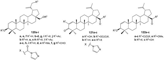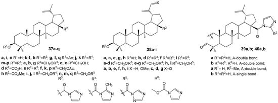Conjugates of BE and BA with imidazole, 2-methylimidazole, or 1,2,4-triazole (Figure 12) were evaluated across several cancer cell lines. Most compounds demonstrated moderate to high cytotoxic activity, particularly in HepG2 (hepatocellular carcinoma), Jurkat (T-lymphocytic leukemia), and HeLa (cervical carcinoma) cell lines. The derivatives with the imidazole moiety R3 at position C-3 (37c, IC50 of 2.0 µM in HepG2) or C-28 (39a, IC50 of 1.7 µM in HepG2; 40b, IC50 of 0.8 µM in HepG2) exhibited the lowest IC50 values [4,43].
